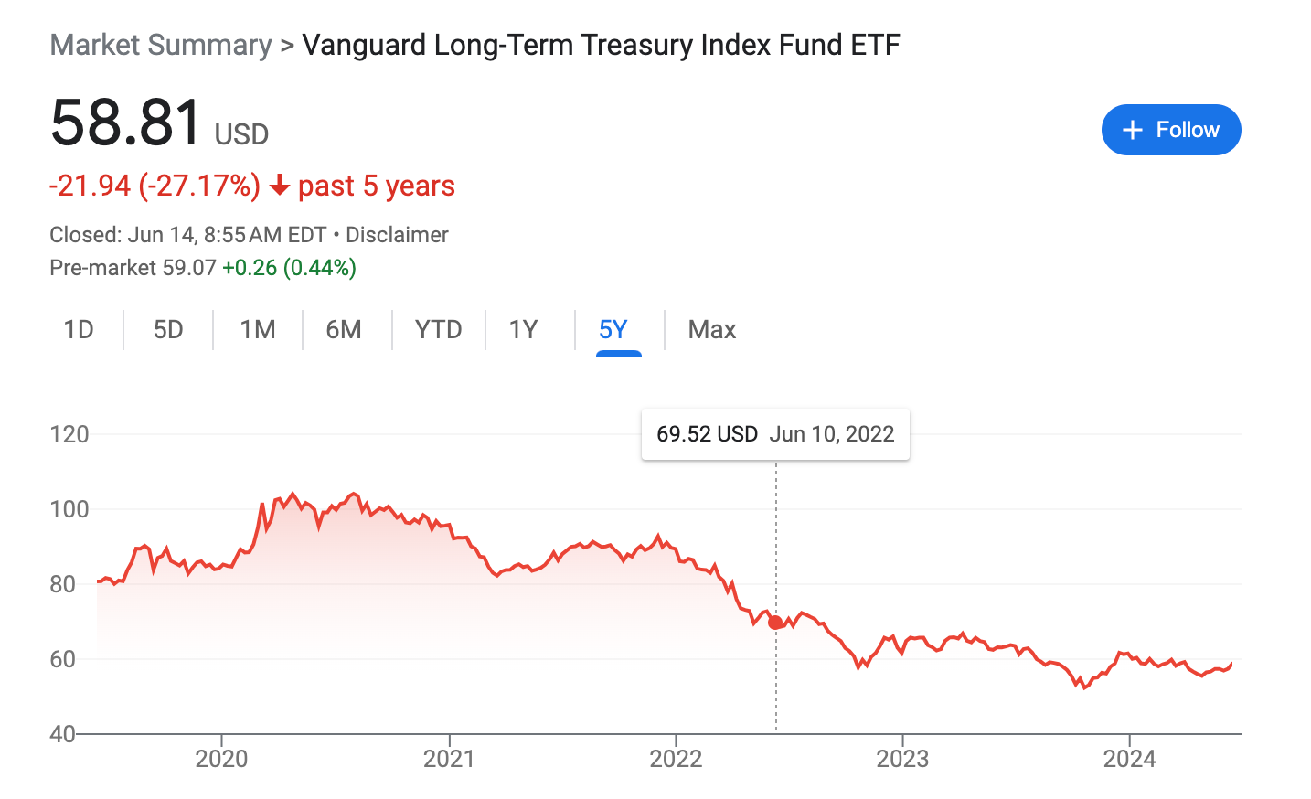 Historically, US treasuries were considered a safe investment, but we can see how horrendous this strategy has been over the medium-term recently. Use the Vanguard Long-Term Treasury Index Fund ETF as an example — holders of these treasuries are down more than 25% over the last 5 years.