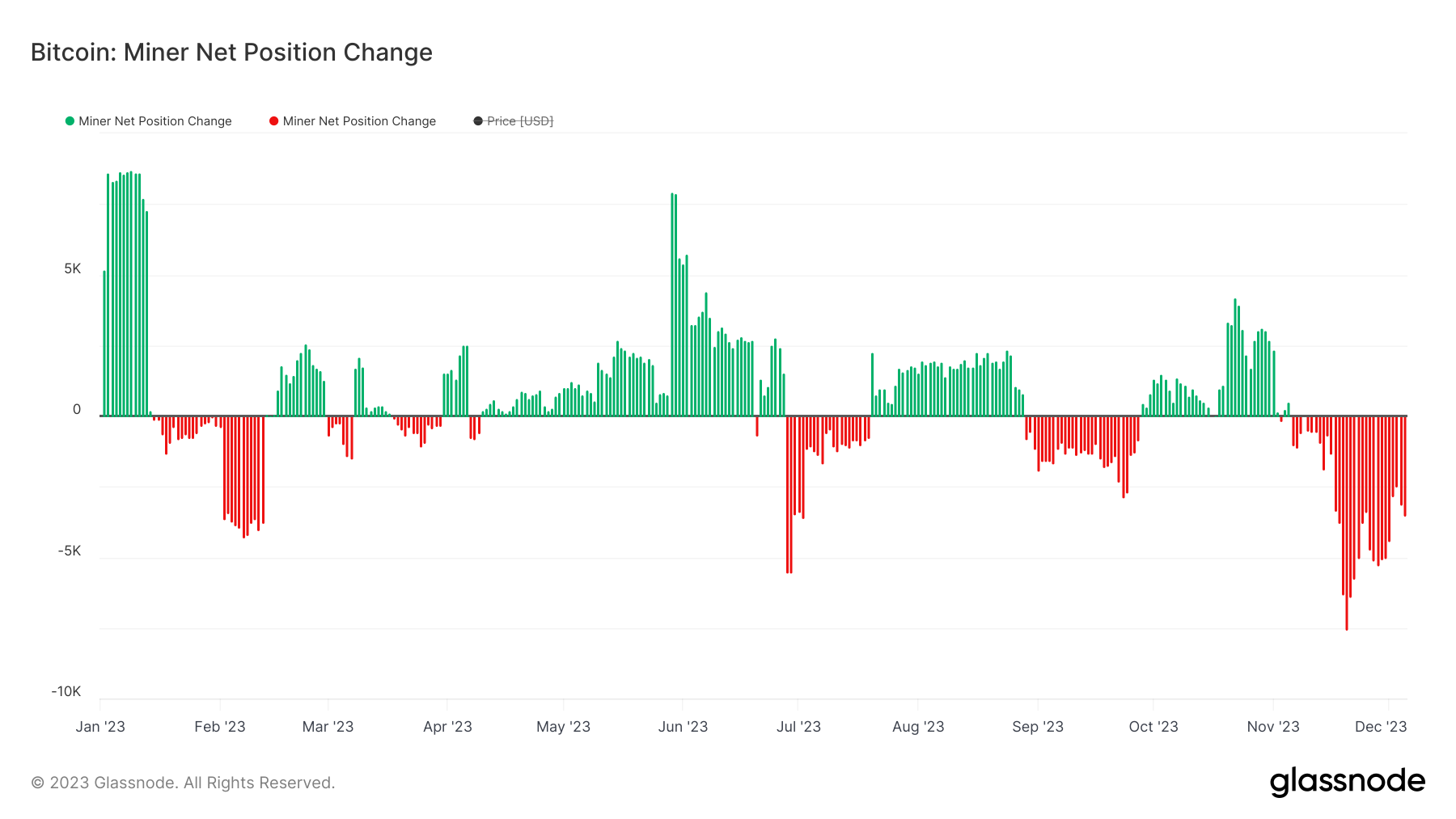 Another interesting data point is how miners are handling the bitcoin on their balance sheet. You can see that miners have been net sellers since the start of November, which suggests that these organizations are taking advantage of the recent price appreciation and selling into the strength to drive further cash reserves.
