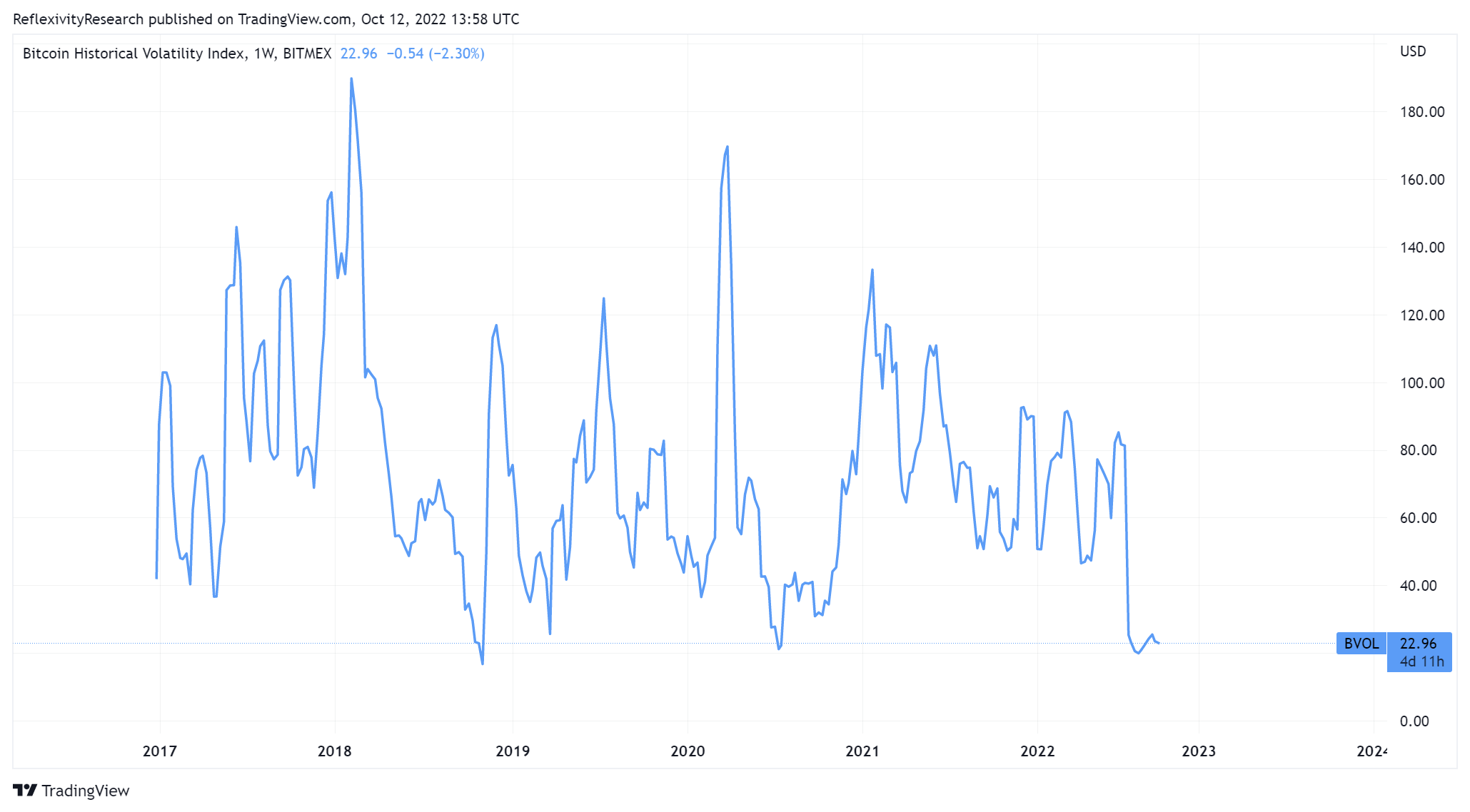 With a tremendous amount of macroeconomic uncertainty overhanging markets, it may be quite surprising for some to see Bitcoin maintain stability in the $18K-$19K range that its been in for several months now. Bitcoin volatility continues to compress near record lows, expressed by the Bitcoin Historical Volatility Index:
