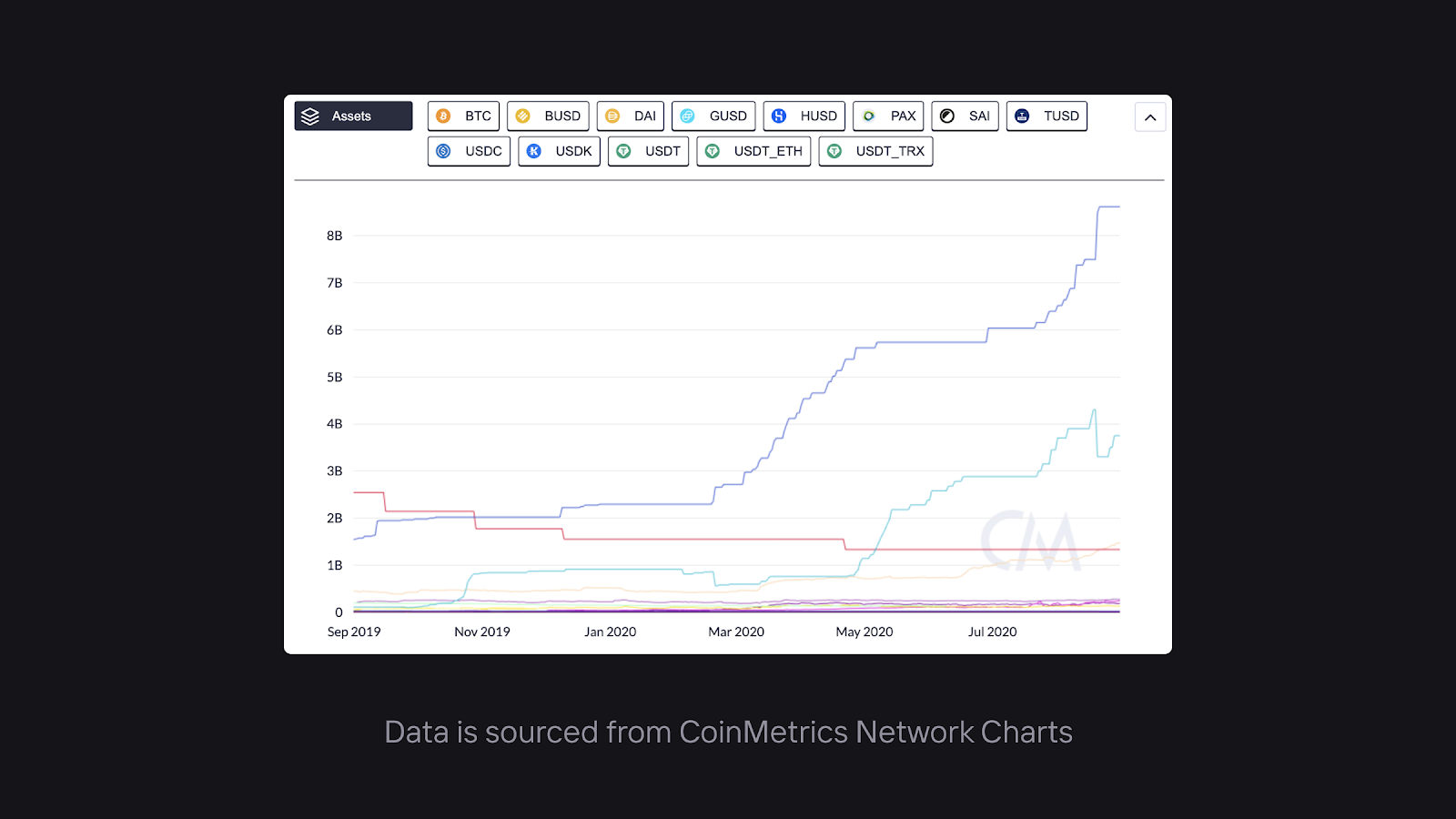 Stablecoins really started to see growth when new primitives came to market. The ability to exchange stablecoins for crypto through decentralized exchanges such as dYdX, 0x, and Kyber or the ability to borrow and lend stablecoins through platforms like dYdX and Compound, made stablecoins that much more powerful. Users could remain on-chain for a lot of their banking needs.
