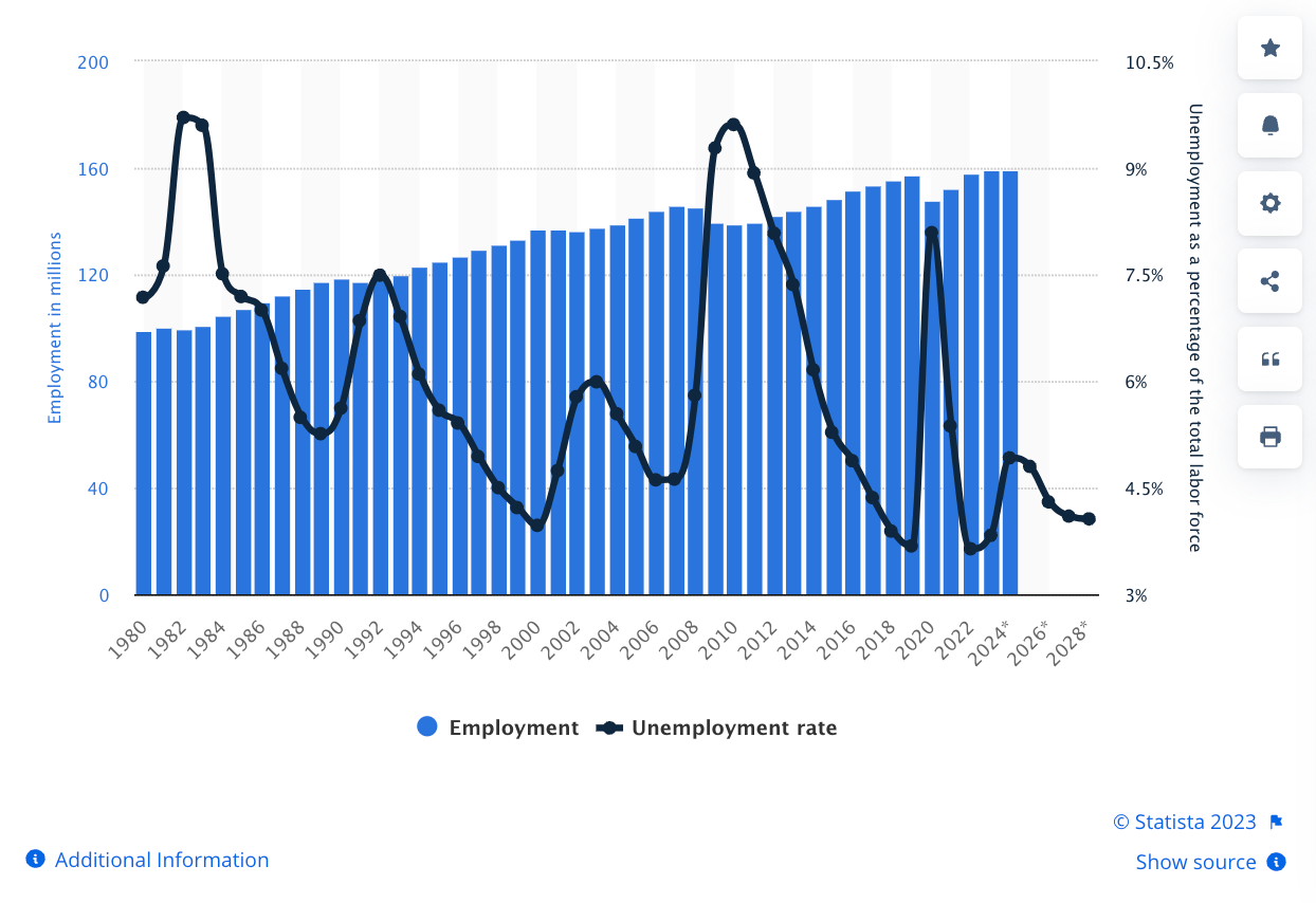 Total employment and the unemployment rate in the United States from 1980 to 2022, with projections until 2028
