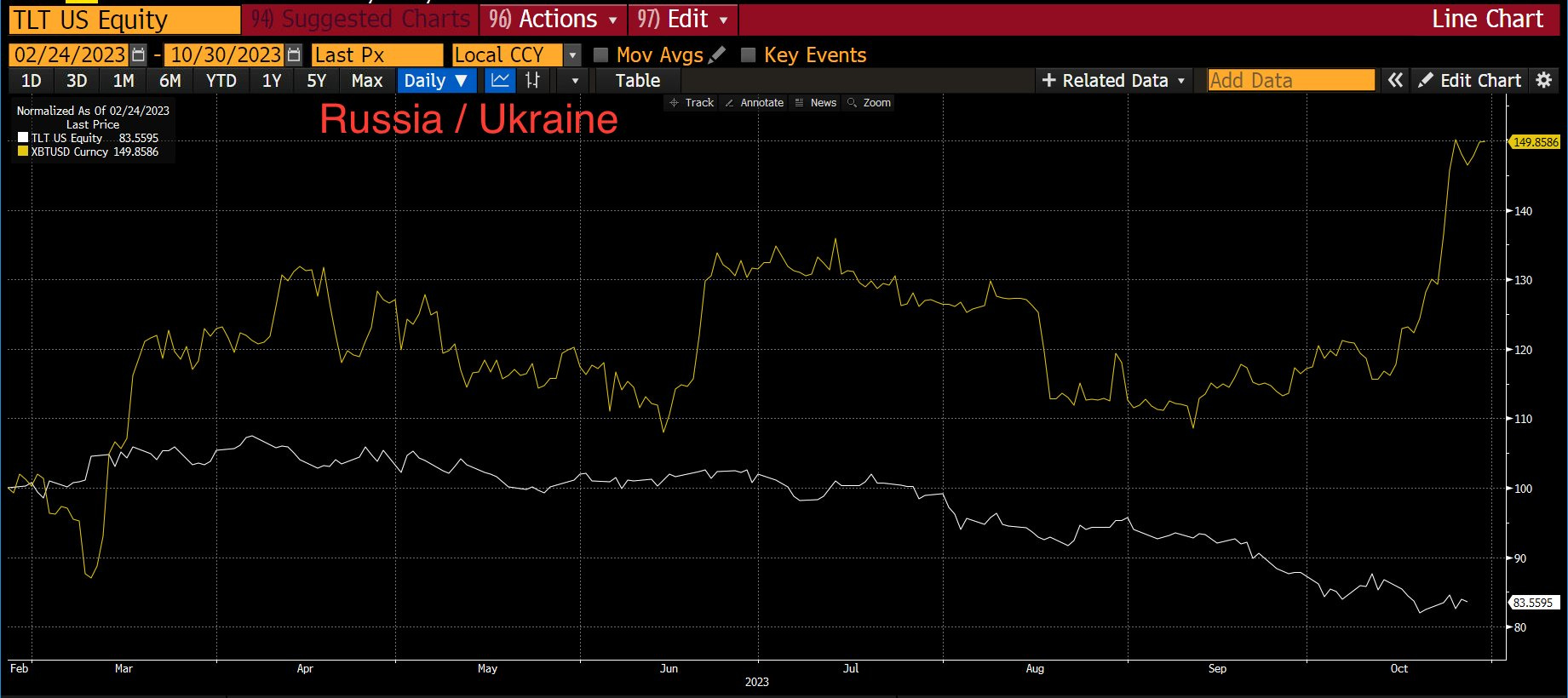 For example, Arthur Hayes points out that TLT - the US Treasury ETF - is down approximately 16% since Russia invaded Ukraine and the same ETF is down about 3% since Hamas killed hundreds of civilians in Israel.