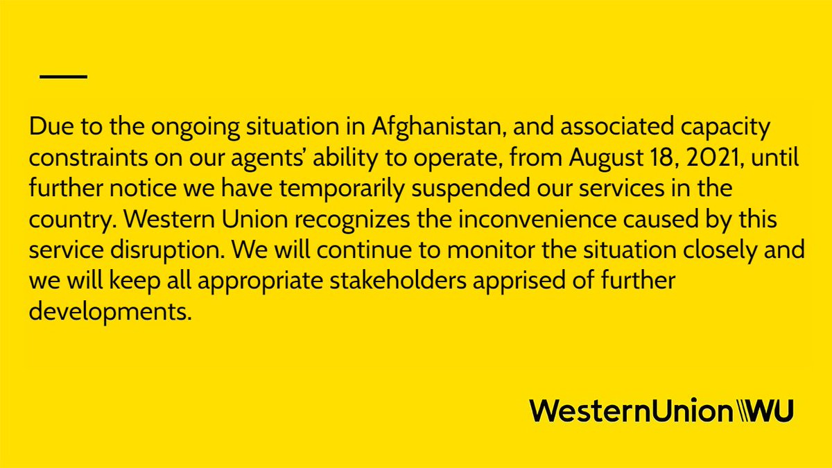 One of the countries that no longer has access to Western Union is Afghanistan. This is because the company decided to suspend all services to the embattled country until the current situation is better understood. Yes, you read that right. The money transmitter that is one of the two most popular services in the country has decided to shut down operations at the exact time that the average citizen needs help the most.