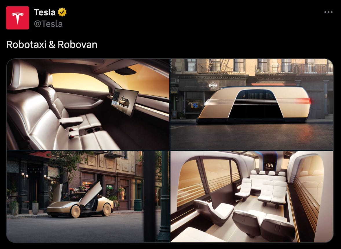 Tesla wasn’t exclusively focused on their humanoids during the event. They also unveiled their prototype for the CyberCab, a robotaxi that will be owned by individuals and participate in a fleet that patrols a city offering ride sharing.