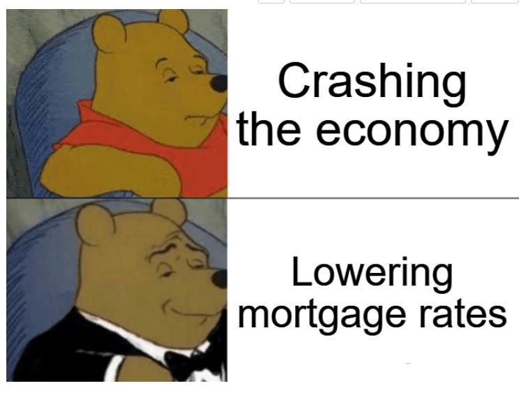 The thing about these policies is that receptivity and enthusiasm really boils down to whether someone is a fan of Donald Trump or not. Ben Carlson had a great meme that explained the different viewpoints perfectly — critics call it crashing the economy, while supporters call it lowering mortgage rates.