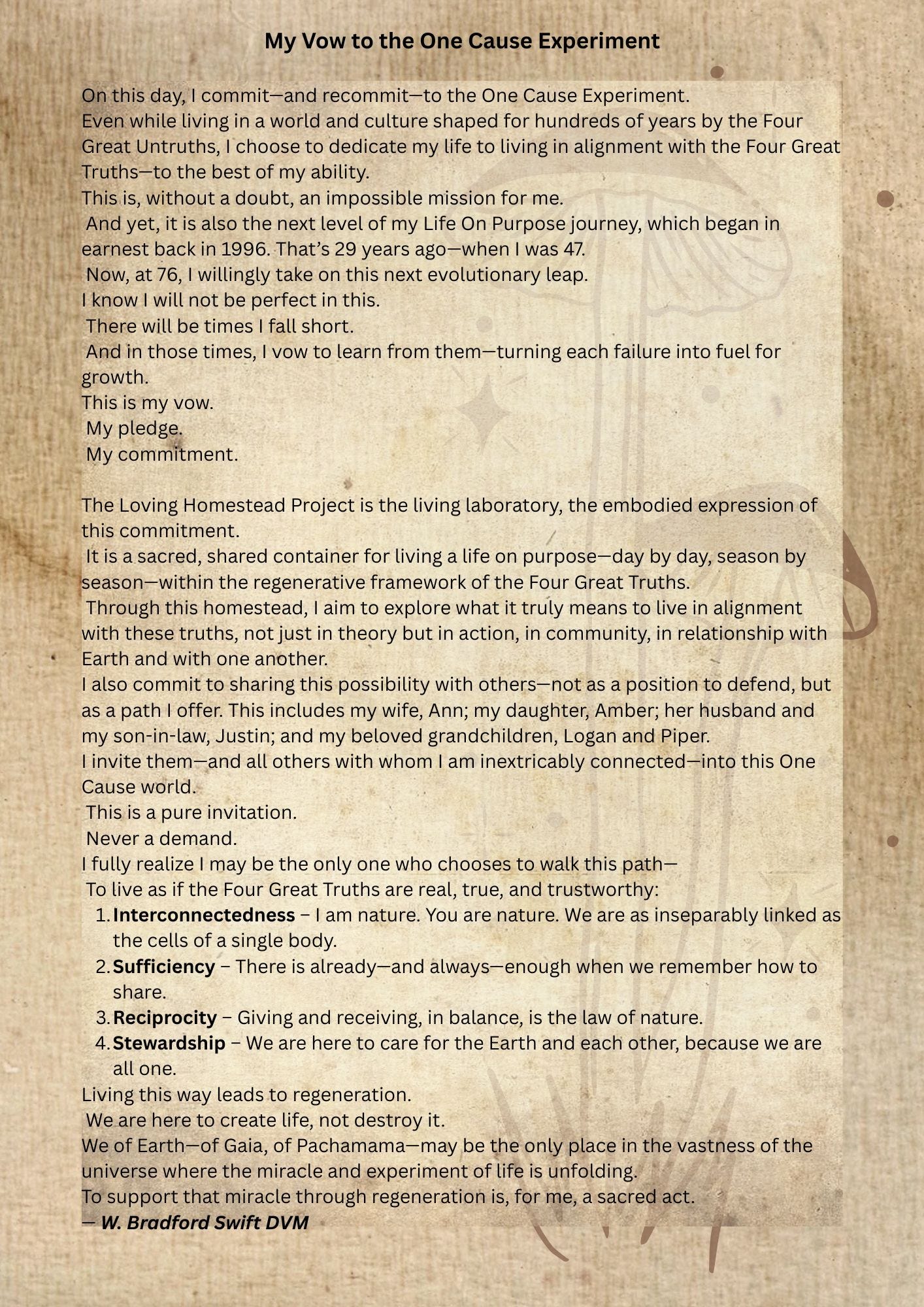 I’ve also decided that now is the right moment to share something even more personal: my Vow to the One Cause Experiment—a declaration I read each morning and evening, and one that defines how I want to live the rest of my life. You’ll find it below this introduction. If it speaks to you, I invite you to sit with it… maybe even speak it aloud or accept my invitation into the One Cause world.