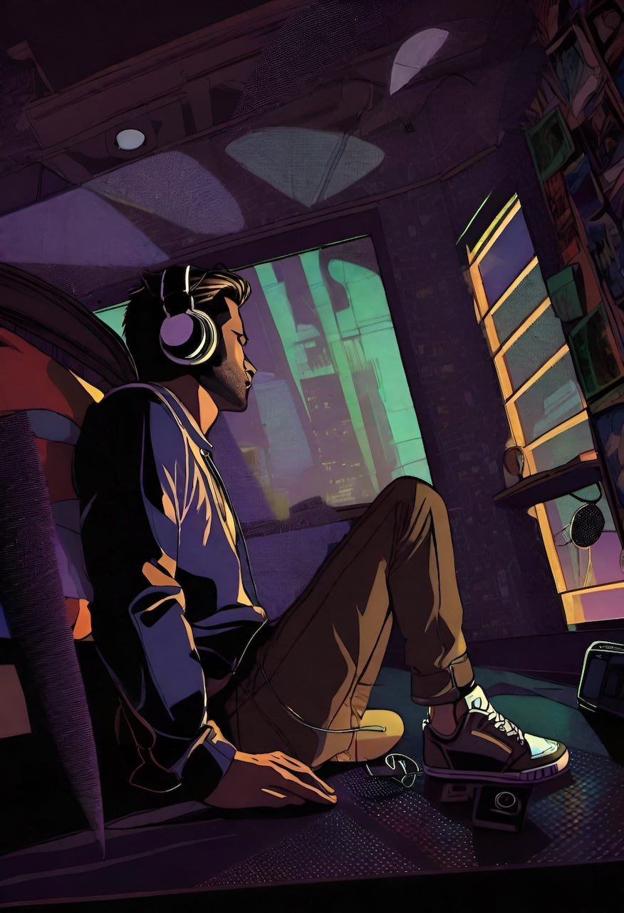 He slumped down next to the bed, the sounds of Telomic playing in his headphones. The lights were off, but the city lights illuminated his room in a rhythmic pulse as vehicles passed by the brightly lit signs outside.