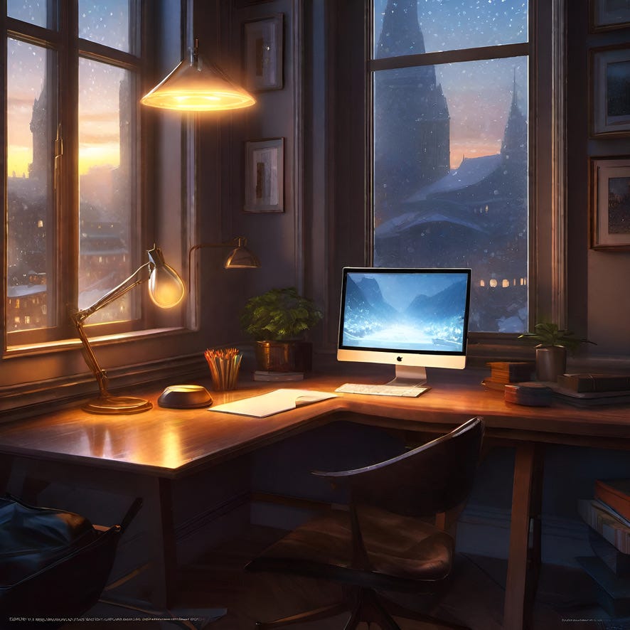 The snow was falling in giant flakes that lazily drifted toward the street below. Their side-to-side motion was mesmerizing - almost hypnotic. The city lights had a particularly warm glow about them this evening, and having just come in from the cold, the warm feeling that rushed down over his body, from head to toe, was a welcome sensation. Apollo pulled the wooden chair from his desk, his finger brushing a spot of dust from the back of the chair.