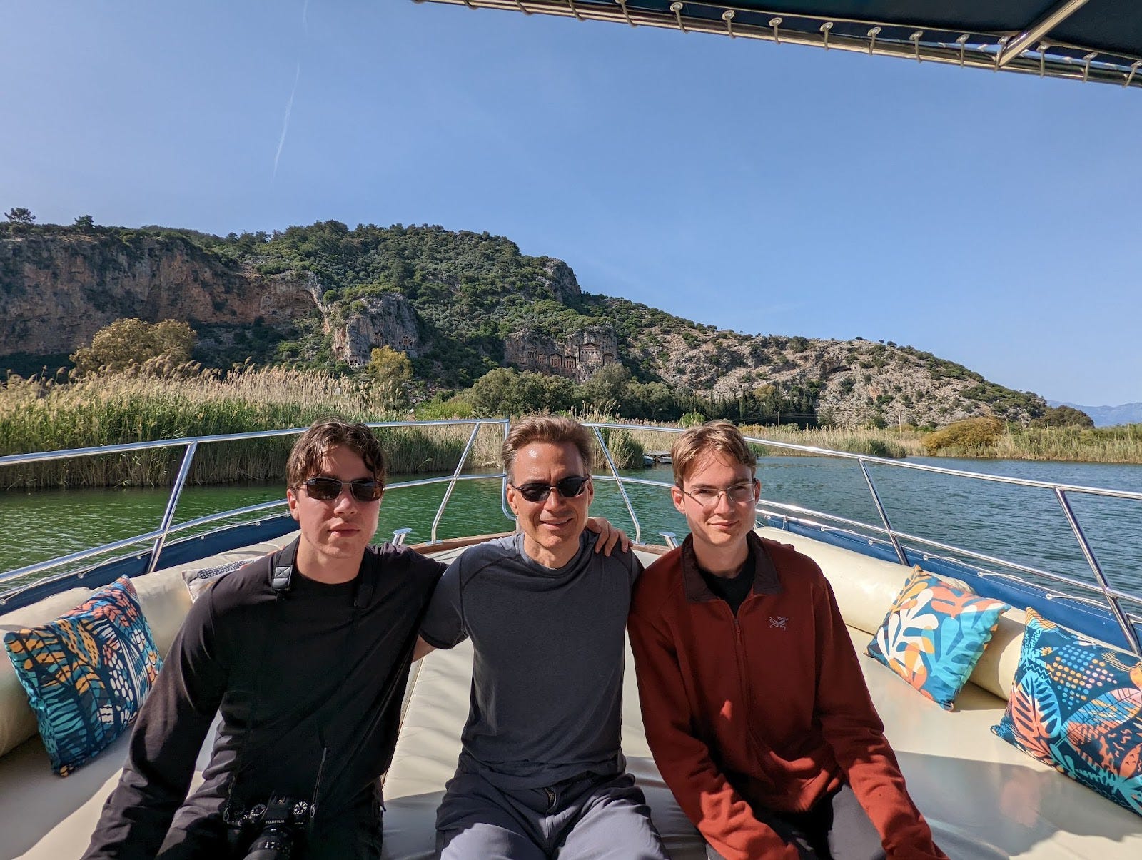 One of the week's highlights was a cruise along the Dalyan Çayı River in Dalyan — site of the ancient Lycian tombs. If you look behind us, you can see the graves on the mountain.