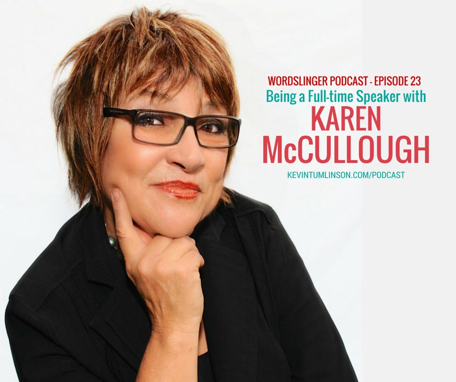 Karen McCullough started in retail, but when her clothing store shut down she wanted a change. She connected with a coach, got some ideas together, and then jumped into a career of public speaking. Today, she’s an energetic and in-demand keynote speaker who talks to corporations and associations about everything from the value of change to customer service and working with Gen Y employees. Listen in on one of most fascinating Wordslinger interviews so far, and learn how you, too, could get into a career in public speaking. Learn more about Karen McCullough's work: Visit her website: karenmccullough.com Follow her on social media: Twitter —@k_mccullough Facebook — The Facebook address given in the show is incorrect. Visit Karen on Facebook at facebook.com/karenmccullough1 || Support this show on Patreon! Visit patreon.com/kevintumlinson || Got a question for Kevin and his guests? Call us at 281-809-WORD (9673) and leave a voicemail that Kevin can read on air! Subscribe and start following the Wordslinger Podcast at kevintumlinson.com/podcast And on iTunes (rate us!) at bit.ly/1zZHmas Learn more about Kevin Tumlinson and his work at kevintumlinson.com. || This episode of the Wordslinger Podcast is brought to you by Happy Pants Books. If you’re a coach, consultant, or keynote speaker and need to “publish or perish,” get your ideas out of your head and onto the page at happypantsbooks.com || Get full access to The Writer_ at kevintumlinson.substack.com/subscribe