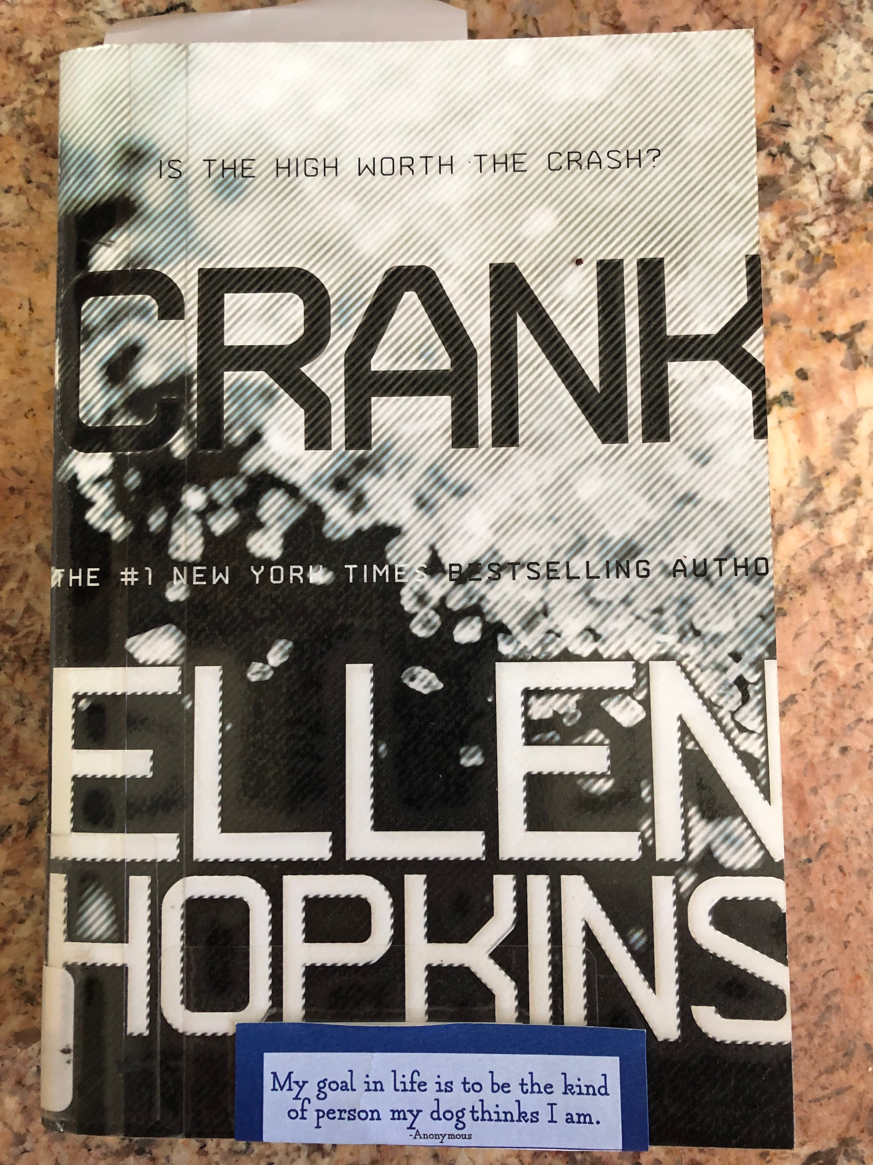 In an afterword, author Ellen Hopkins discusses in what ways Crank is based on her family’s real life experiences. Her daughter became addicted after visiting her addicted father. The family descended into a sort of hell: a drug dealer comes calling for money owed him. Her daughter breaks into the house, steals from her family and forges checks in Hopkins’s name.