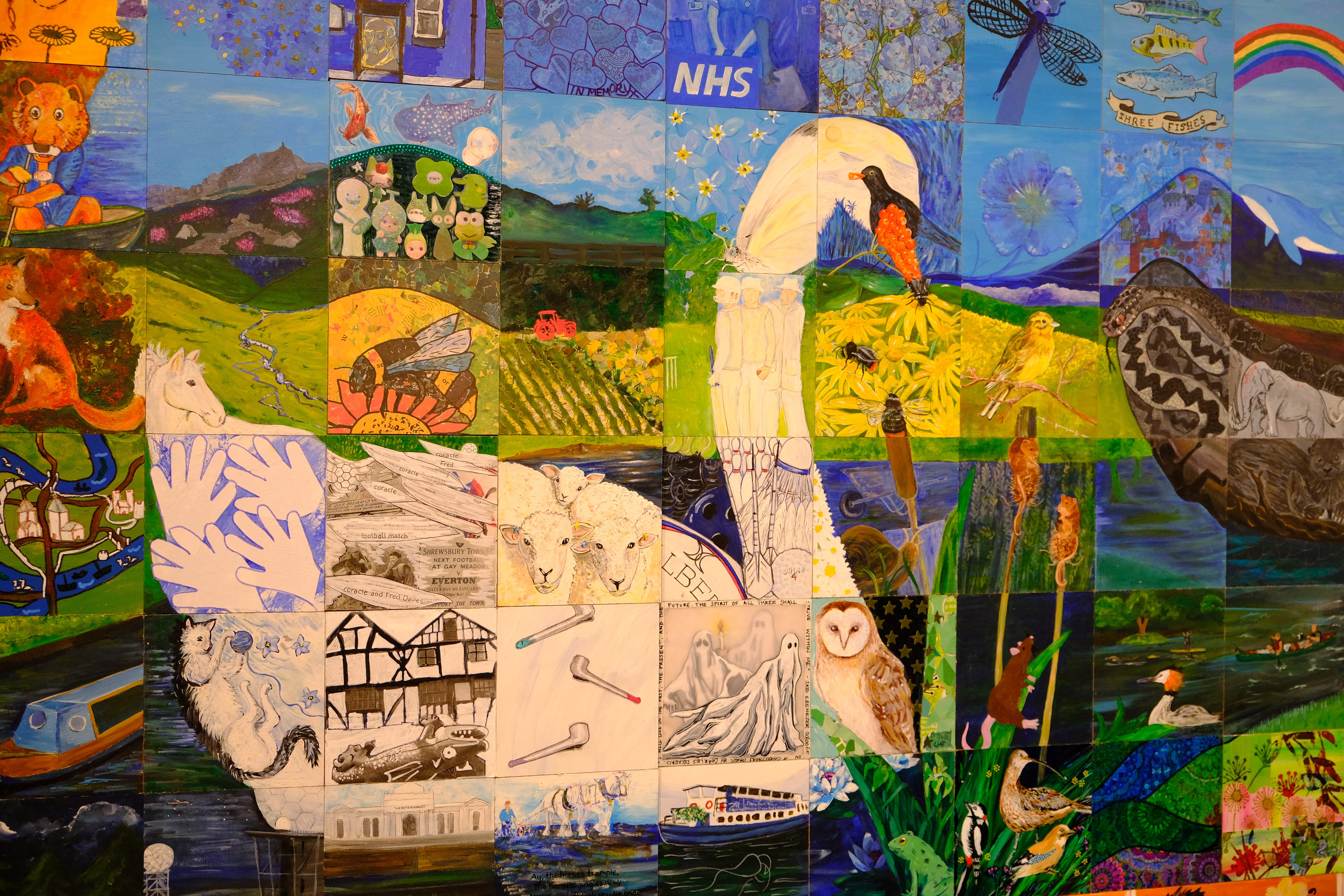 Shrewsbury’s Flaxmill Maltings commissioned Sarah to create a mural to brighten up the area on the former-canal side of the building’s café. As Sarah works with a variety of fragile and delicate materials, the plan was always to digitise the completed work, print it onto a weatherproof banner and suspend that from the railings by the café. That version of the mural mosaic was unveiled on Saturday afternoon.