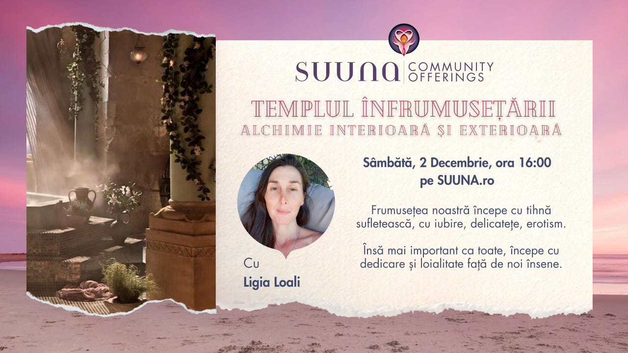 "Templul înfrumusețării" cu Ligia Loali, un eveniment SUUNA Community Offering, a fost o întâlnire valoroasă și plină de inspirație pentru participante. Ascultă acum înregistrarea pentru a explora feminitatea prin meditații și exerciții de conștientizare, creând un spațiu de conexiune profundă cu sinele și cu esența feminină.