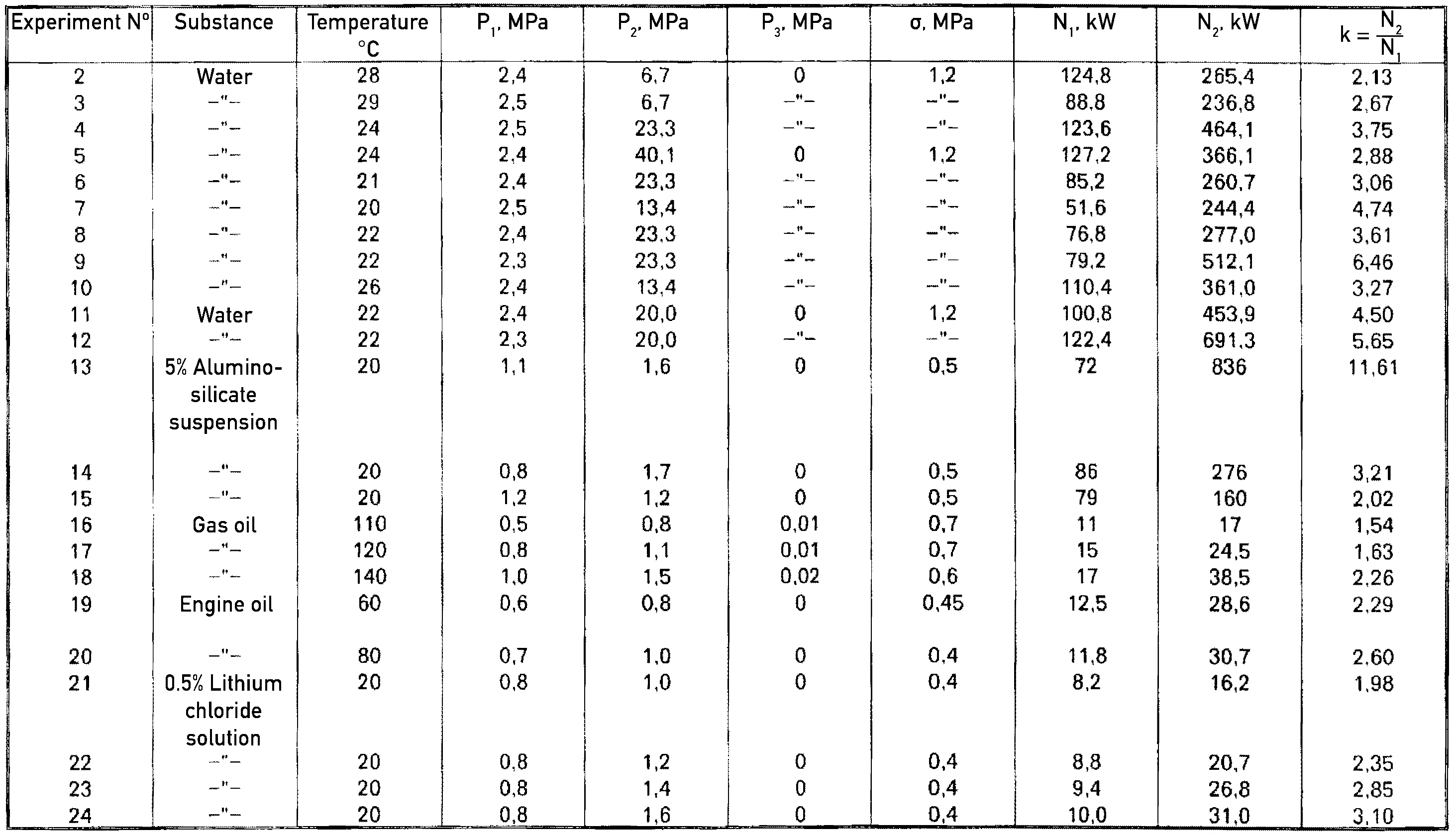 These were performed in a similar way to that described in Example 1. The substance under processing, its temperature, treatment parameters (P1, P2, P3, σ), power consumption (N1), heat output (N2) and coefficient (k) are given in Table 1.