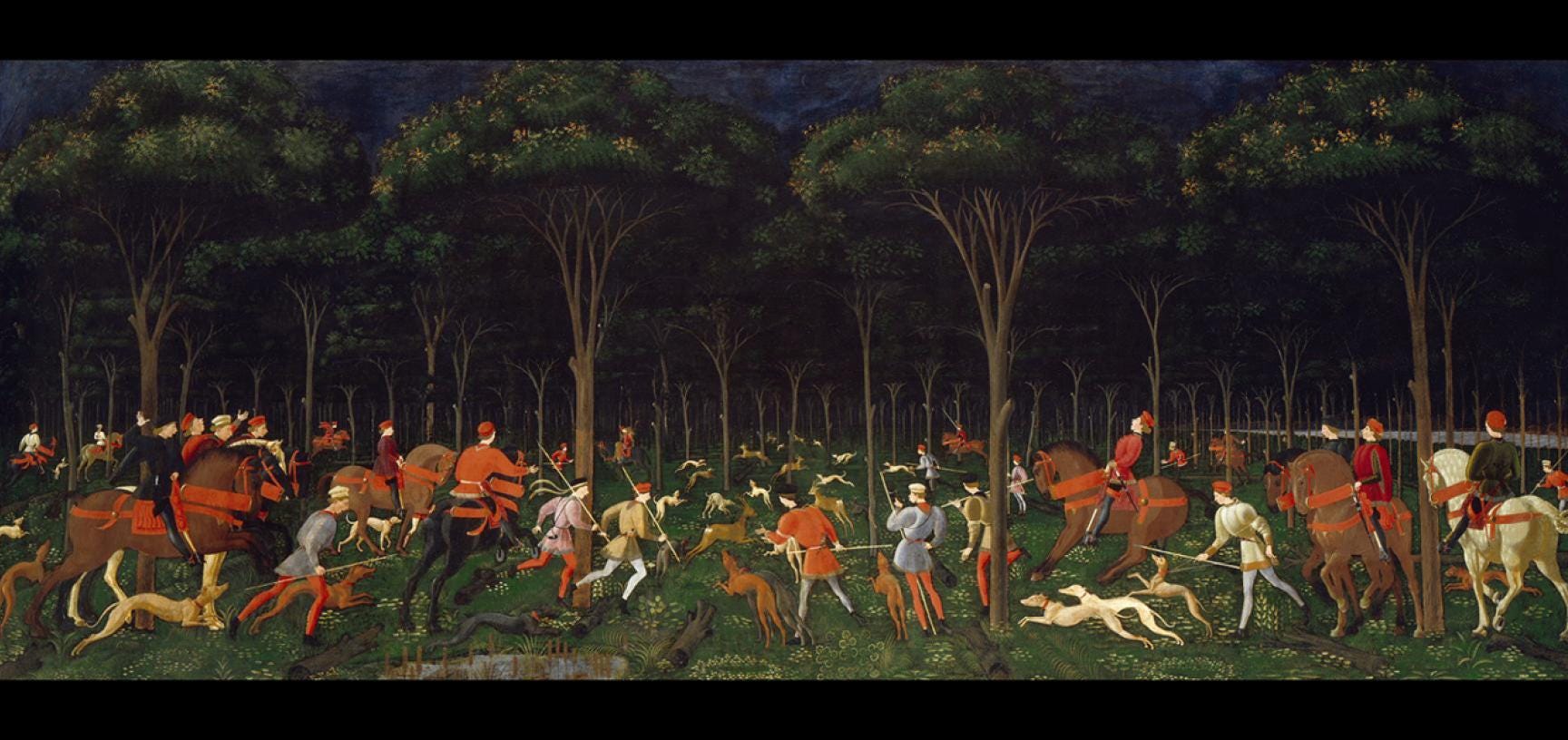 The painting above, Uccello’s “Hunting in the Forest,” is the image that Mrs. MCC refers to at the beginning of the conversation.