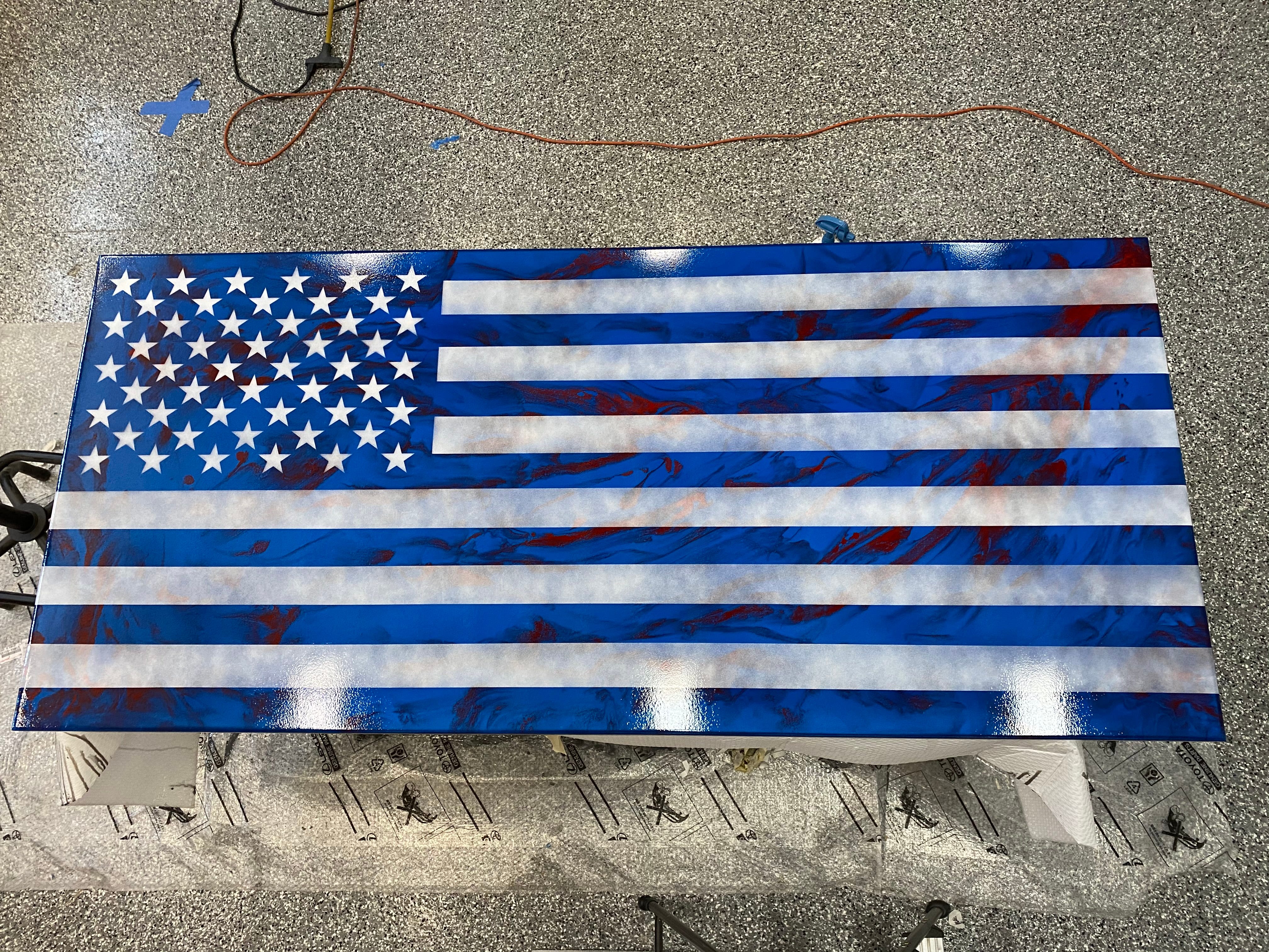 In the audio I mention that I am dropping off a big epoxy art flag for a new church, here is a pic of that.