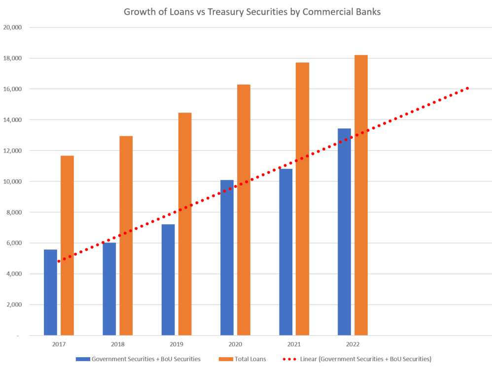 From the 2022 Bank of Uganda statistics, The Government securities grew by 141% from 2017 to 2022 yet total loans grew by just 53% in the same period even when Deposits (The biggest source of Banks’ funding) grew by 73% in the similar period, majority of it was channeled to Government Securities.