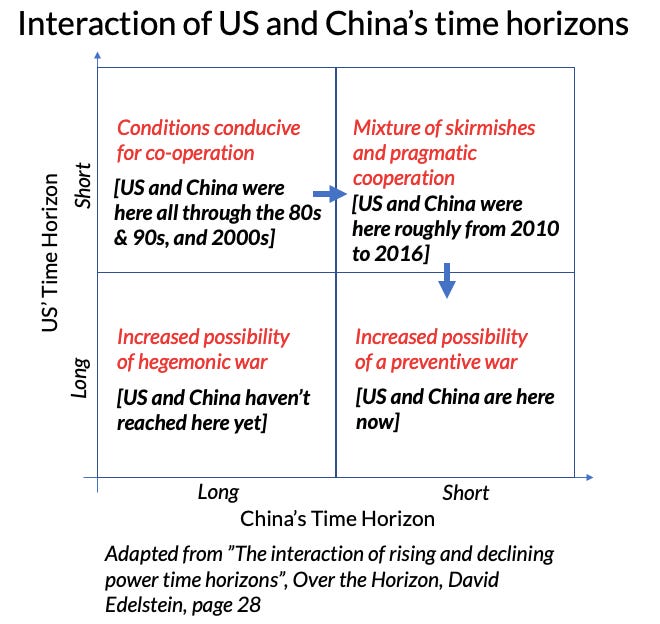 This framework also explains that a preventive âwarâ scenario is not inevitable. If there is a rethink in PRCâs approach, a shift to either of the remaining three quadrants is possible. With Xi Jinping at the helm, it looks unlikely though. Despite the perception that PRC thinks long-term, Xi is operating with an extremely short-term time horizon and inviting pushbacks from a host of countries as a result.