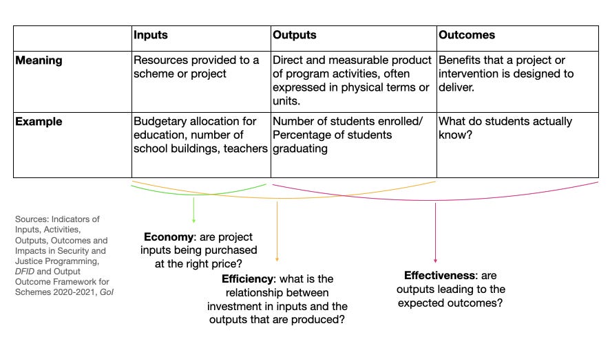 Ideally, any government programme should begin with a theory of change that connects the desired end state (outcomes) to the programme activities that need to be carried out (outputs) which further require a set of resources (inputs).