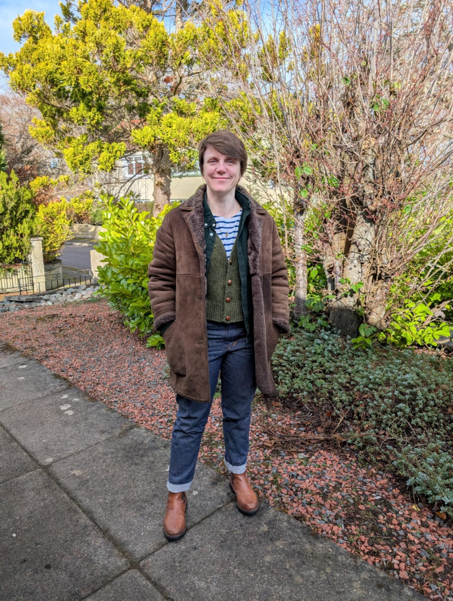 Wearing the repaired sheepskin coat and Morgan jeans!