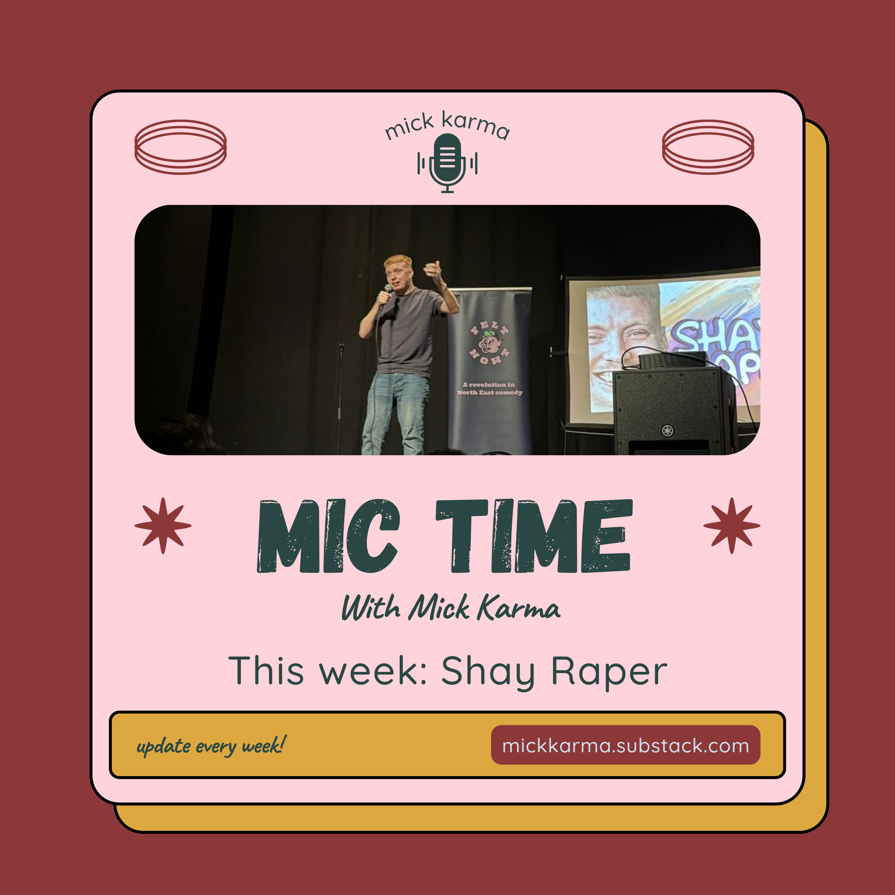 I’m delighted to bring you a chat with Shay Raper this week. He’s a comedian from Newcastle that I have seen a few times, often doing slots on the same night.