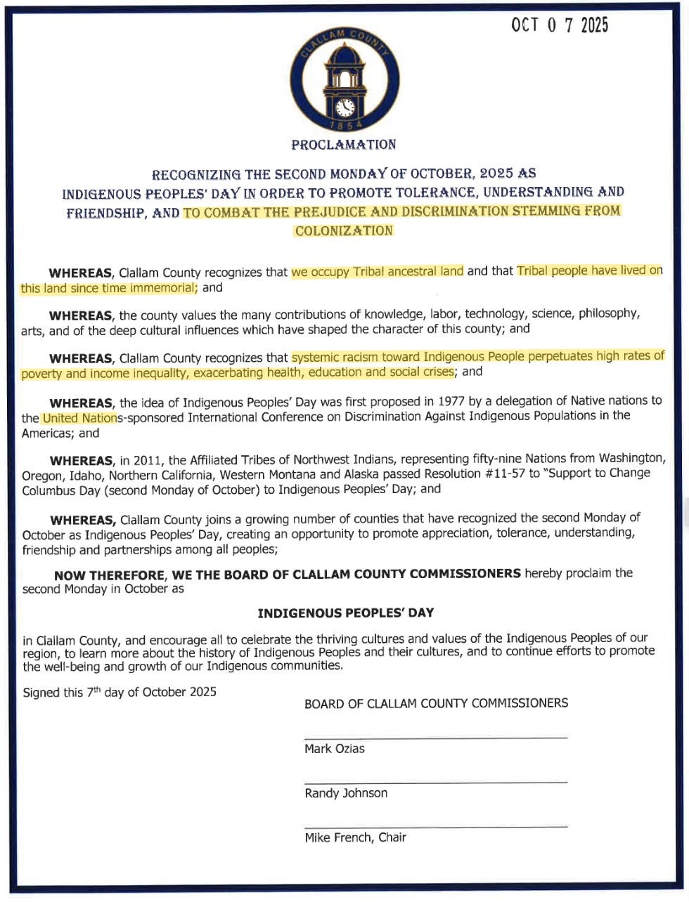 Weeks before asking voters to voluntarily raise their property taxes, the Clallam County Commissioners will issue a proclamation today condemning “the prejudice and discrimination stemming from colonization.” The gesture, delivered with moral superiority, implies that today’s residents — the very people funding county government — still bear collective guilt for the actions of centuries past.