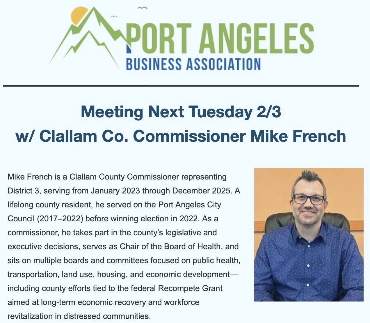 What was billed last week as an opportunity to hear County Commissioner Mike French speak about the Recompete grant to the Port Angeles Business Association turned out to be something else entirely.