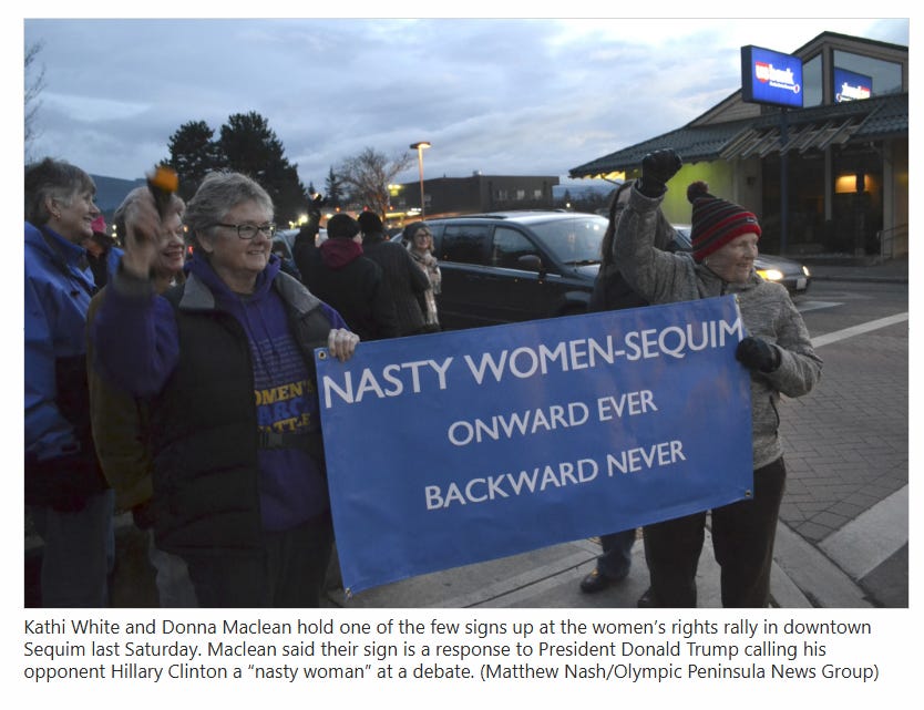 That includes Donna MacLean’s right to write a letter, speak her mind, and peacefully protest. In fact, back in 2017, she exercised that very right during a women’s rights rally in downtown Sequim. We supported her right to protest then—and we support it now.