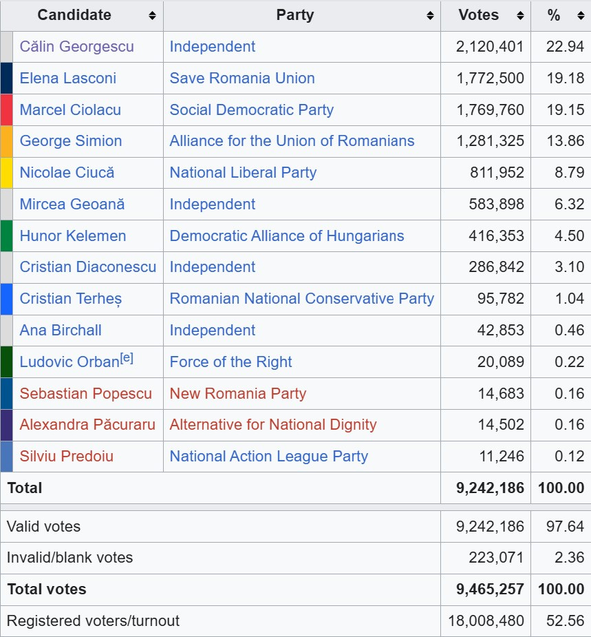 Herunder kan du se resultatet af den første runde af det rumænske præsidentvalg, der blev afholdt 24. november 2024. Călin Georgescu fik over 2 millioner stemmer, hvilket svarer til næste 23 % af alle de afgivne stemmer. (se link)