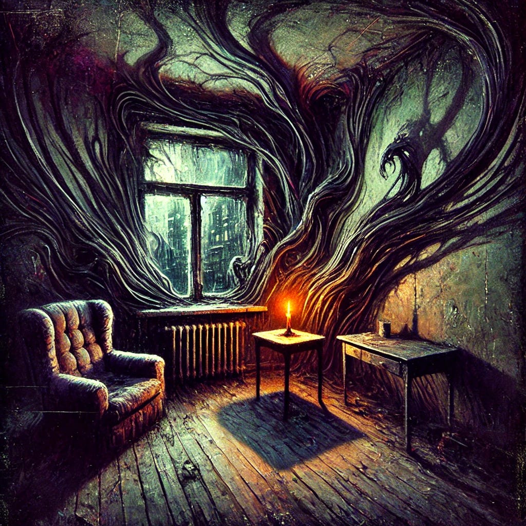 In a cramped studio apartment on the 13th floor of a nondescript high-rise, Gordon Grayson sat motionless in his frayed armchair, staring blankly at the flickering flame of a single candle. The weak orange light danced across his gaunt features, casting long shadows that seemed to retreat into the room's dark corners. Outside his grimy window, the city bustled with its usual frenetic energy, but time stood still inside Gordon's four walls.