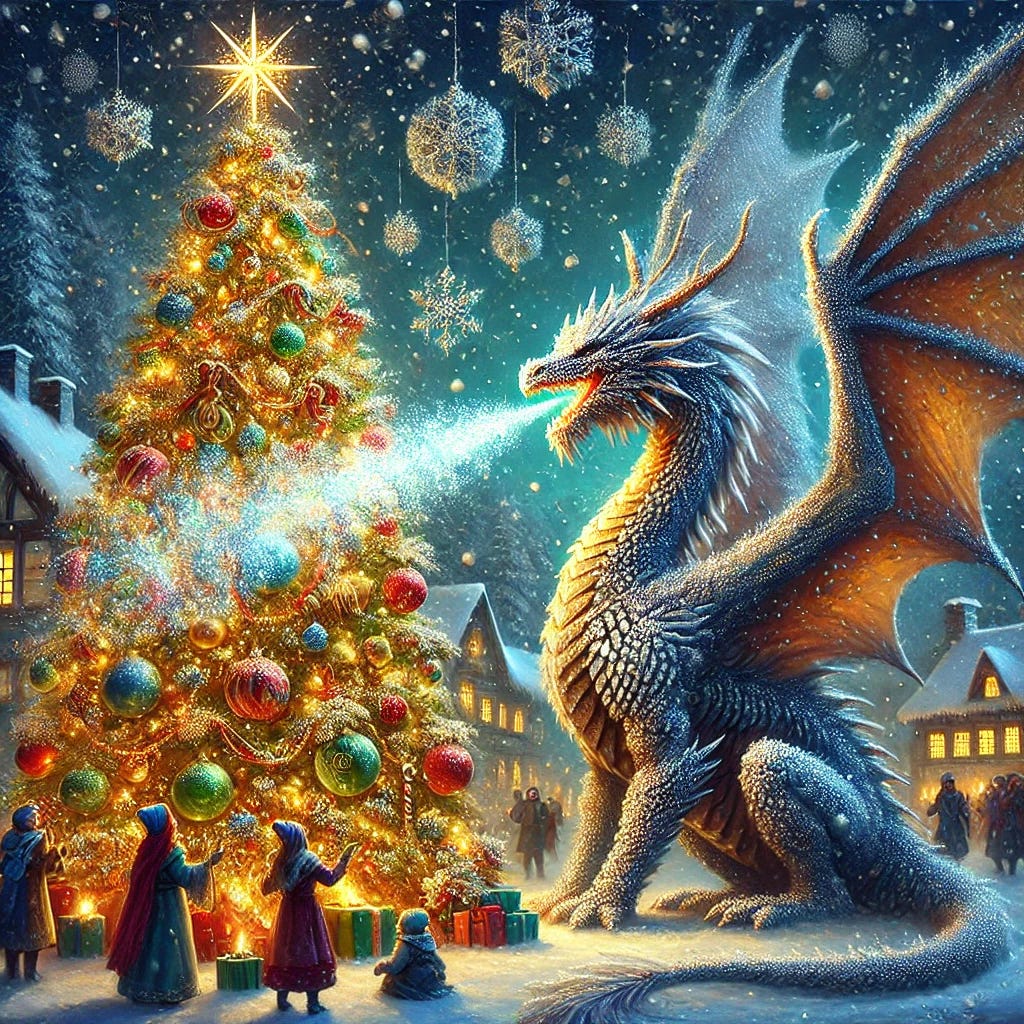 As the years passed, the village transformed into a beacon of harmony between humans and dragons. The Christmas tree in the square grew ever larger, and its decorations now included crystalline sculptures created by Ember’s frost breath alongside traditional ornaments. Every year, a grand festival was held to celebrate the bond between humans and dragons, attracting visitors from lands far and wide.