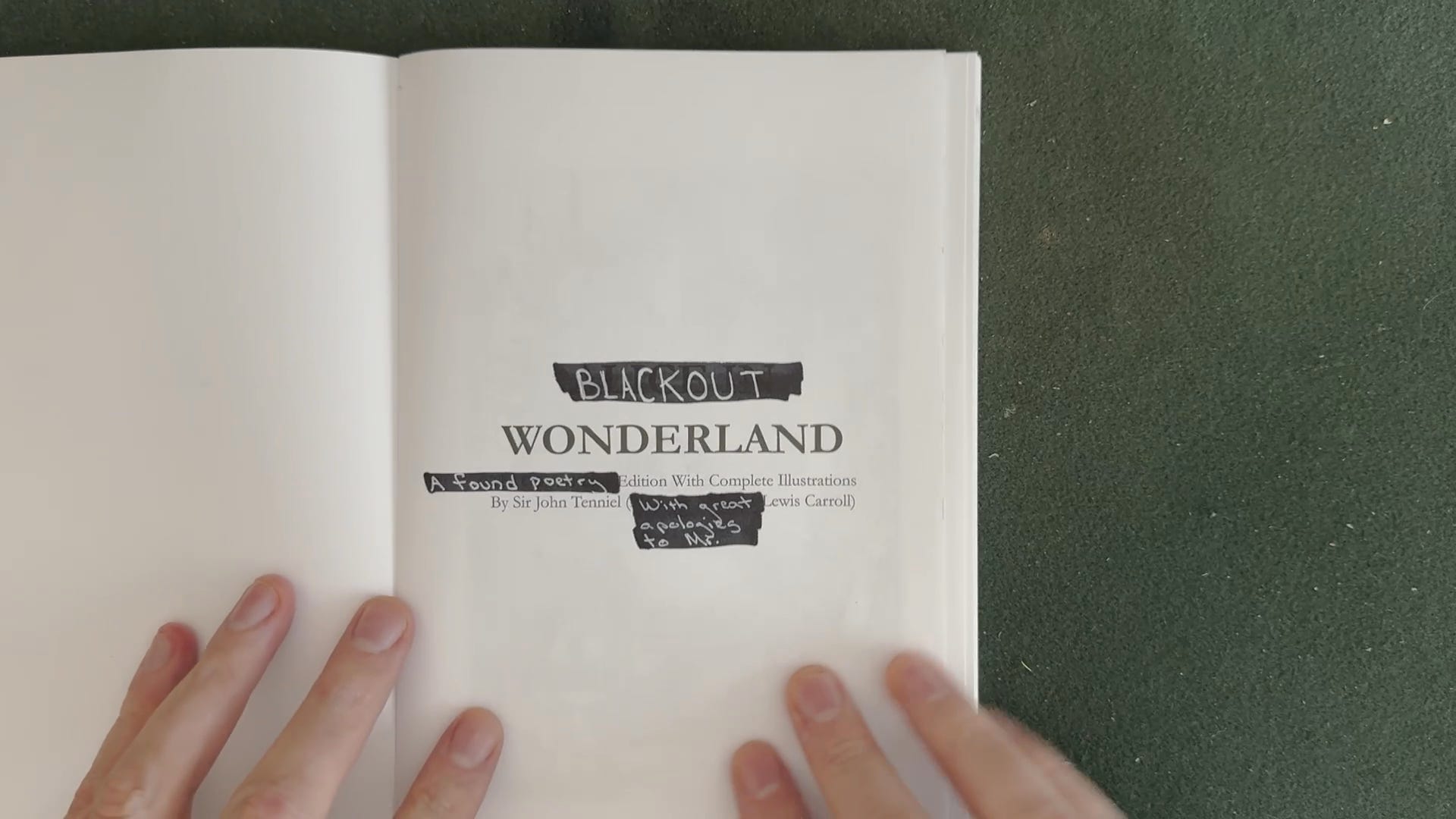 Awhile back, I gave myself the task of writing one long, continuous blackout poem from Lewis Carrol’s Alice in Wonderland. This is the result of that challenge, which was roughly four months in the making. The result is far stranger than I thought it might turn out to be, and took directions I never intended.