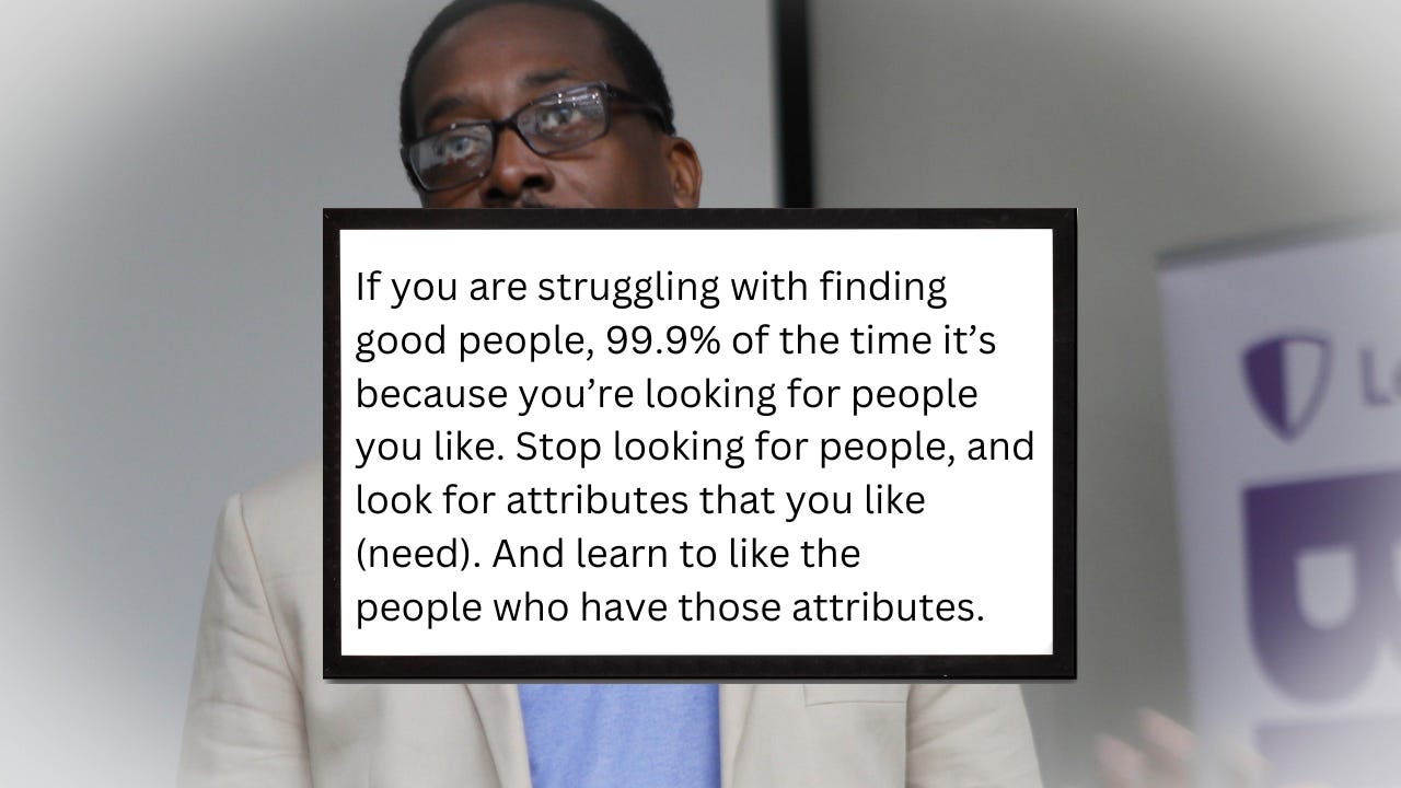However, a crucial lesson for entrepreneurs is that you need people with the right attributes—not just a pleasant personality or initial rapport. There is an axiom: “Wherever you go, there you are.” Essentially, if someone consistently struggles to grow and succeed across different environments, the issue often lies within. Unlike the stock market, in personal growth, past performance—or lack of it—often signals what the future holds.