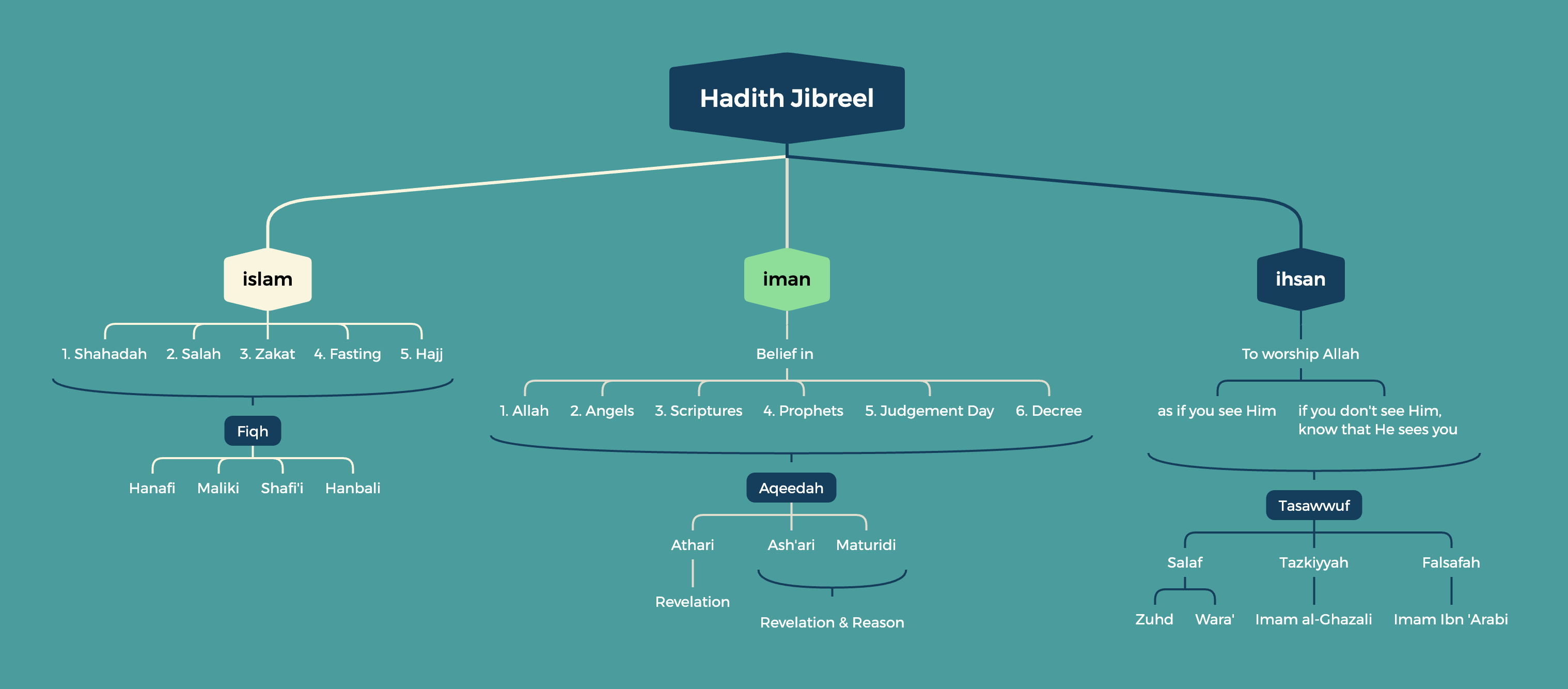 Iman addresses matters of belief, formalized into the science of Aqidah. Within this domain, several schools of thought emerged: