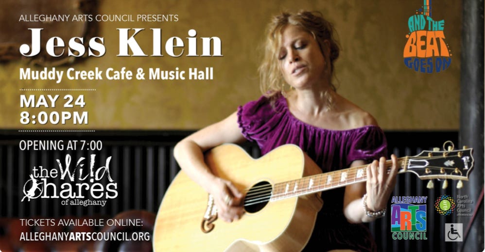 Join me and my full band Friday 5/24 at Muddy Creek in Sparta, NC! So excited to play at this gorgeous listening room for the first time and bring you all the rock-folk-whatever I am you can handle. Special guests The Wild Hares open. 8 pm show. Sponsored by the Alleghany Arts Council.