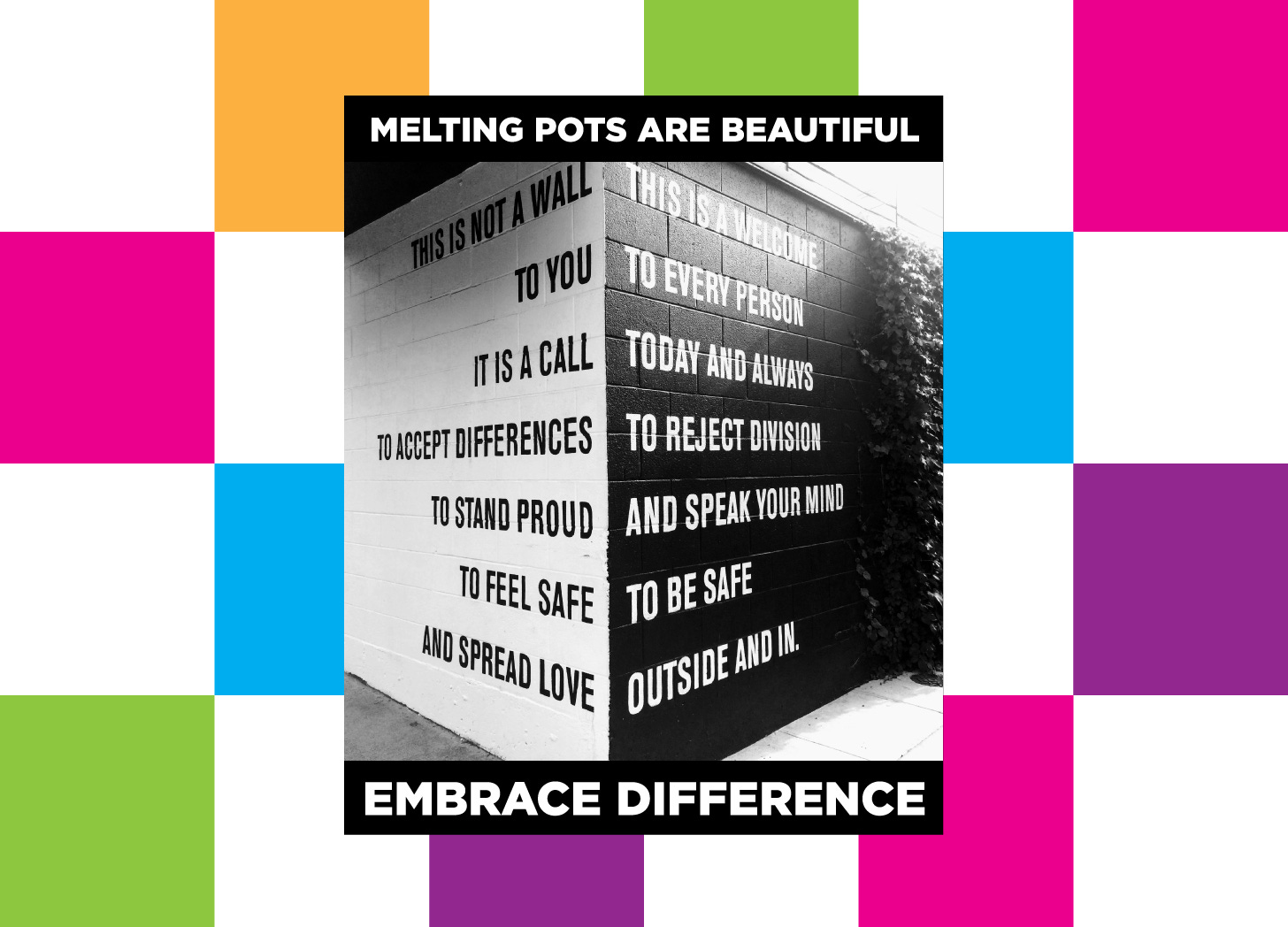 1. THIS IS NOT A WALL, THIS IS A WELCOME. TO YOU, TO EVERY PERSON. IT IS A CALL, TODAY AND ALWAYS. TO ACCEPT DIFFERENCES, TO REJECT DIVISION. TO STAND PROUD, AND SPEAK YOUR MIND. TO FEEL SAFE, TO BE SAFE. AND SPREAD LOVE OUTSIDE AND IN.