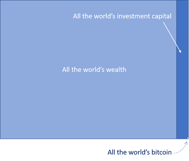 The rectangle represents the world’s wealth ($1 quadrillion). The dark blue stripe represents the world’s investment capital ($40 trillion), and the yellow pixel is bitcoin’s slice of the pie. Tiny, even at $10,000.