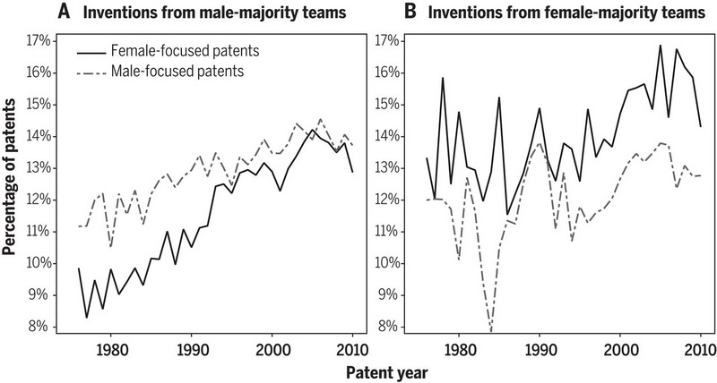 Koning, Samila, and Ferguson (2021) analyze a set of ~400,000 US biomedical patents from 1976-2010. For each patent, they classify the gender of the inventors based on their names (they can match 98% of inventors with 95% confidence; note they have a binary classification of gender, which they point out is a not appropriate in all cases). They next run a sample of the text of these biomedical patents through an algorithm designed to classify academic articles into different biomedical categories. This algorithm classifies about 13% of these biomedical patents as being related to “female organs, diseases, physiologic processes, genetics, etc.” and another 13% as being related to male analogues. They also cross-check these classifications with a variety of alternative metrics: are patents classified as having a female focus more likely to be based on all-female clinical trials? Are they more likely to be related to diseases that have much higher incidence in women than men?