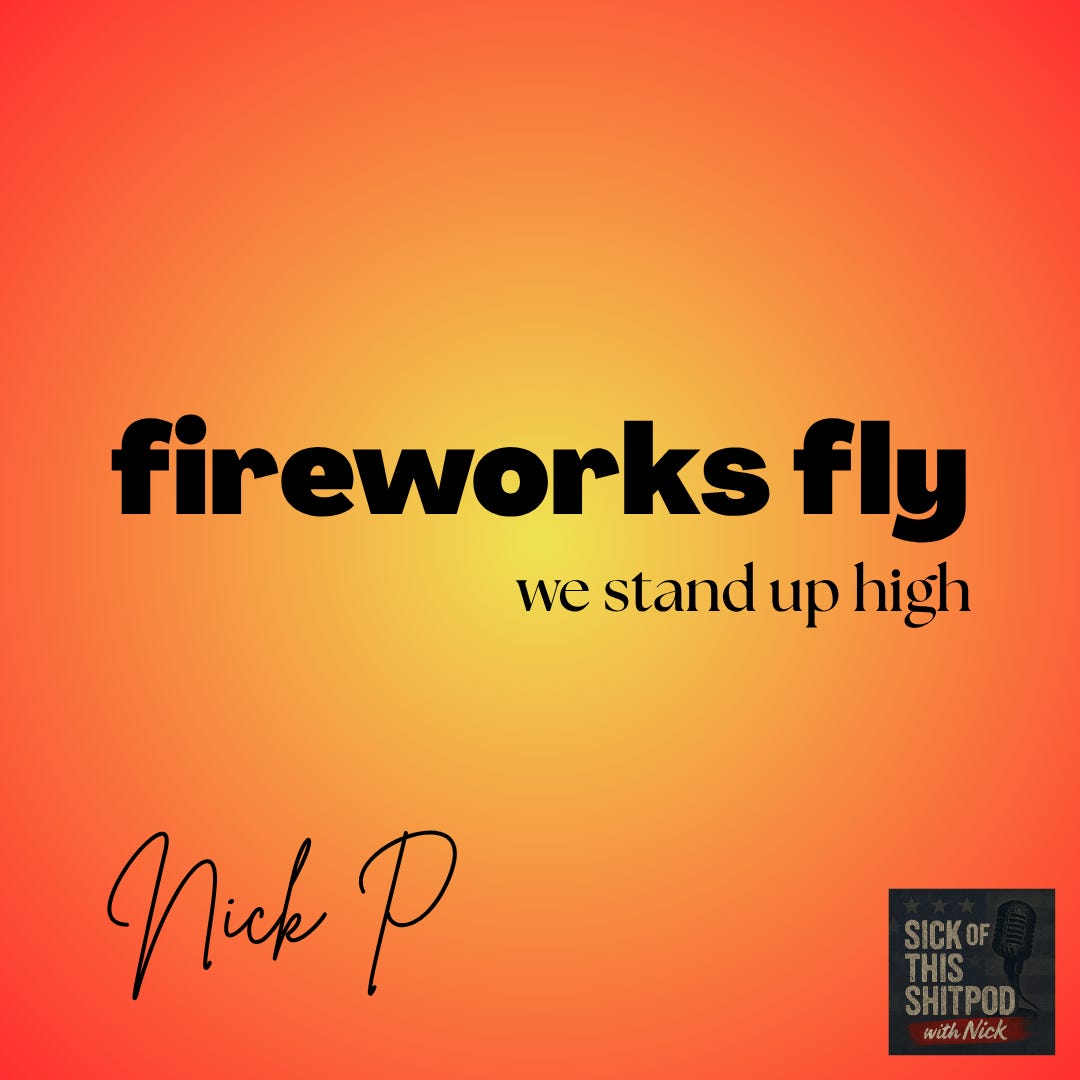 Hey y’all, welcome to Sick of this Shitpod and I’m Nick, your host. Today is episode 7 - fireworks fly. I’m an Army veteran. I’m damn proud of my service to this country and the Oath I swore when enlisting. It’s appalling what we have become and we have strayed so far. I wrote this poem on Independence Day, in honor of that patriotism and what has been lost; however, what was lost can be found. Lost is not gone, just misplaced. fireworks fly is a call to regain it and retake our symbols.