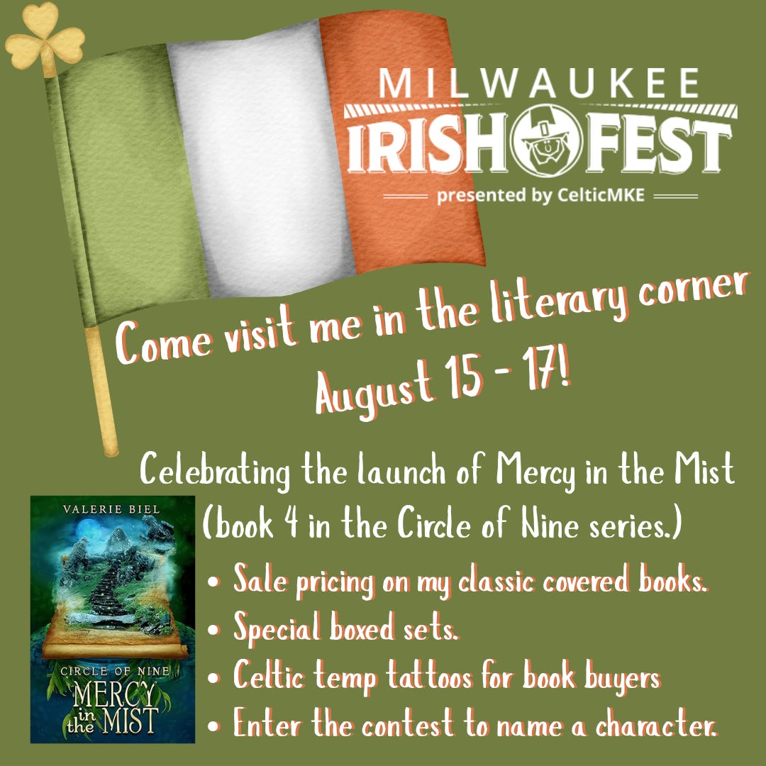 The official book release date is August 5 . . . but the book launch celebration is at Milwaukee’s Irish Fest (the biggest Irish festival in the nation), August 15 - 17. I’ll be in the Literary Corner in the Cultural Village. Please stop by and visit me. You can enter a drawing to have a name you suggest chosen to be featured in my next book. And if you purchase any books, you’ll get a Celtic-themed temp tattoo. It’s going to be great craic!