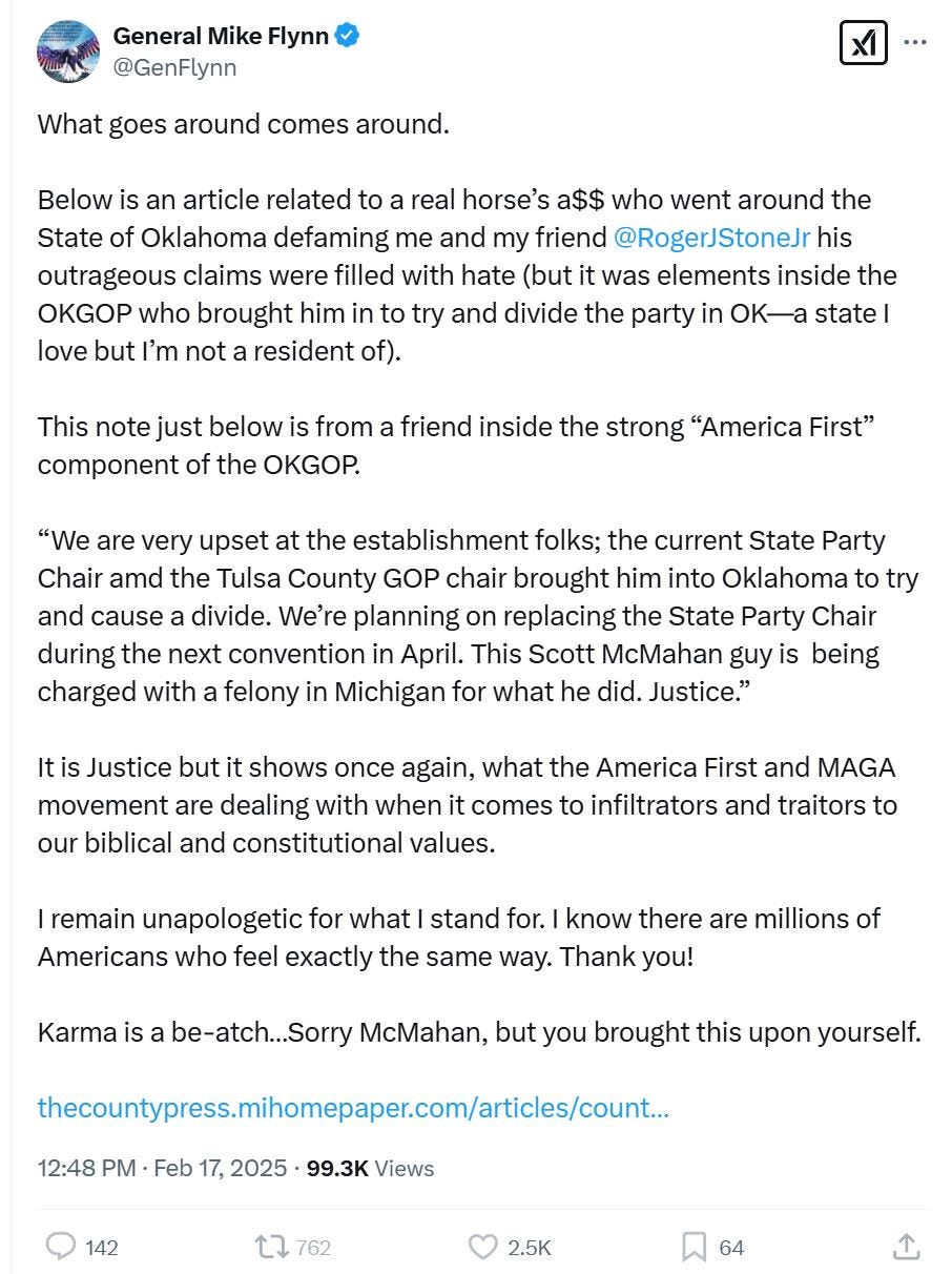 Flynn himself strongly implied that this was done to me because I have exercised my First Amendment rights in criticizing him, calling the charges justice and karma for my work in exposing him. He also called me a horse’s ass.
