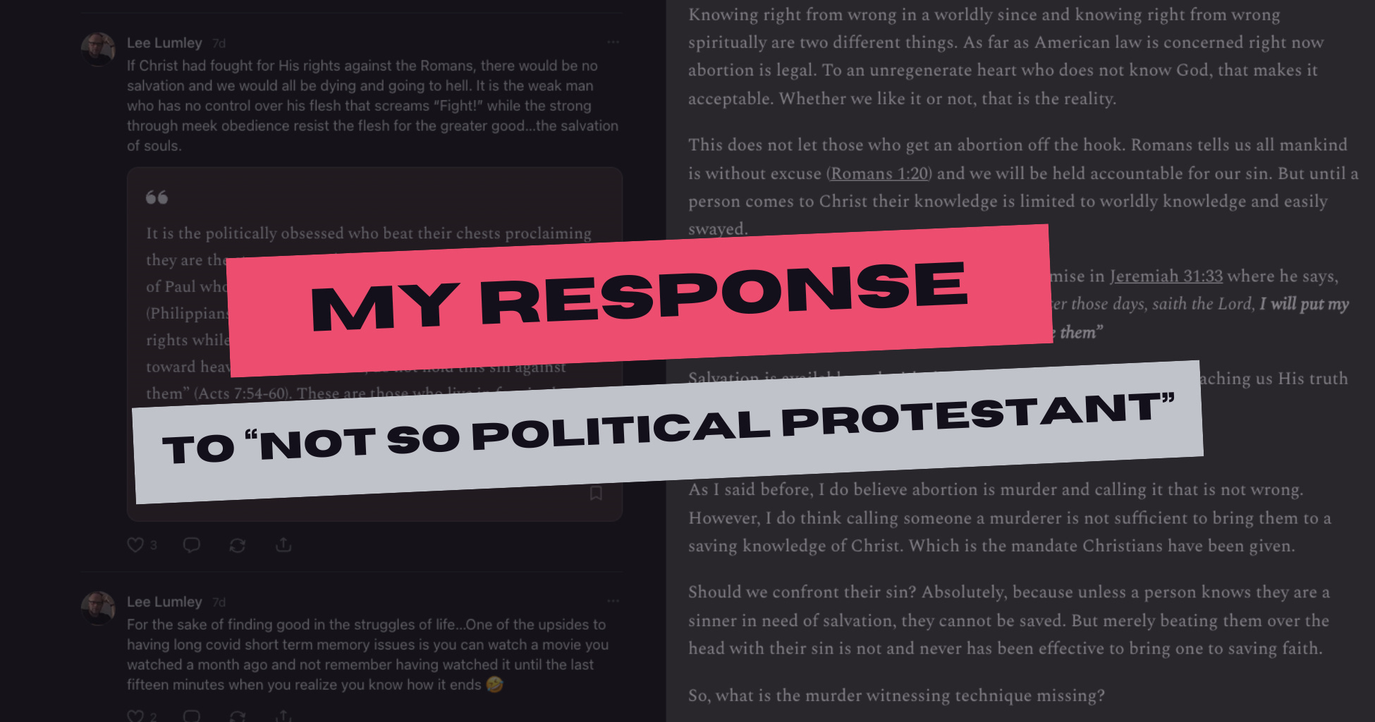 After this, Lee quickly drafted a response to my episode where he systematically dealt with my objections that I brought up. I thought it was well written, easy to follow, and a good read all in all. You can check it out here: