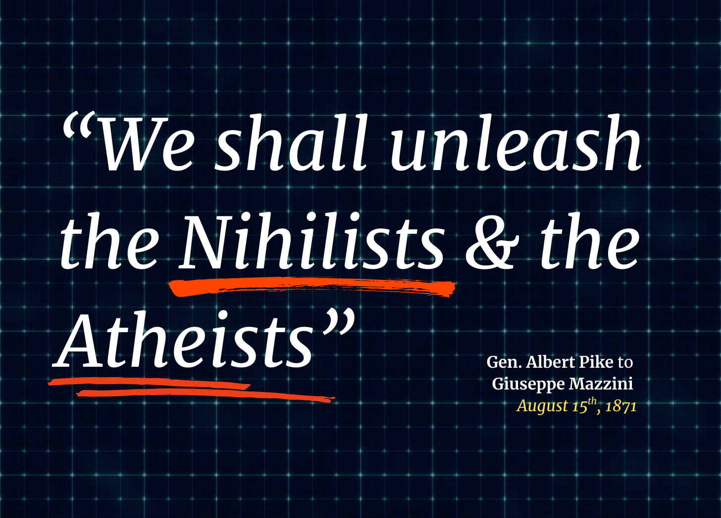 “[..] Meanwhile the other nations, once more divided on this issue will be constrained to fight to the point of complete physical, moral, spiritual and economical exhaustion… We shall unleash the Nihilists and the atheists, and we shall provoke a formidable social cataclysm which in all its horror will show clearly to the nations the effect of absolute atheism, origin of savagery and of the most bloody turmoil.” ~ Confederate General Albert Pike to Giuseppe Mazzini dated August 15th, 1871 (The text was first confirmed to exist by Myron Fagan in his Vinyl Recordings made in 1967)