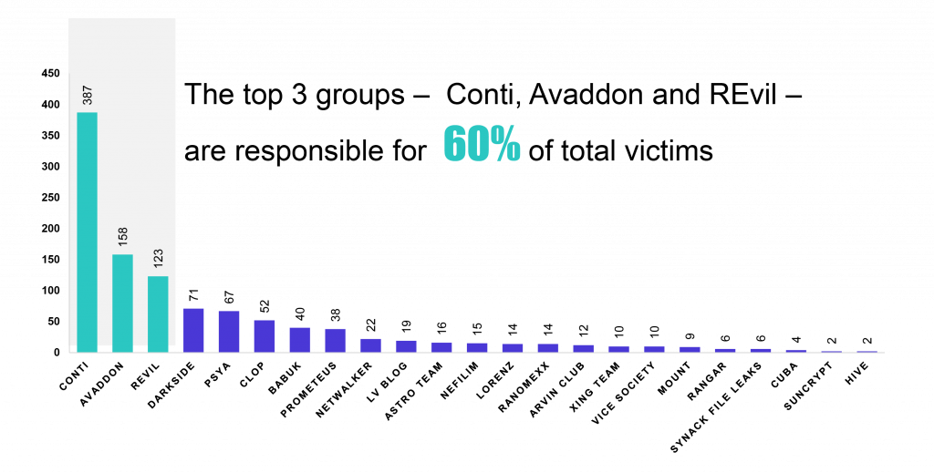 * In the first six months of 2021, 23 ransomware groups attacked more than 1,000 organizations, in 18 different industries, across 66 countries.