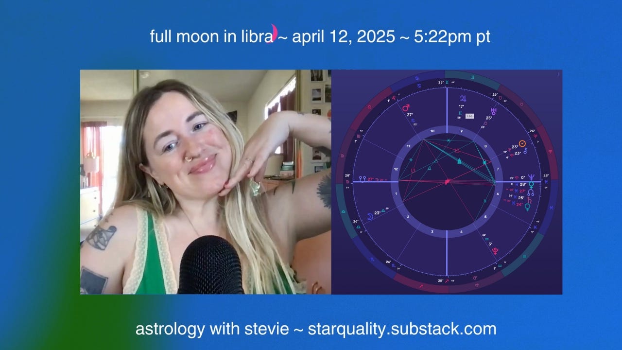 Today is a turning point, starchildren! The Full Moon happening at 23° of Libra on April 12, 2025, at 5:22 PM PT isa shimmer of welcomed change. The first Libra lunation that’s not an eclipse in years and a mere 40 minutes after the full moon Venus goes direct and the Retrograde is OVER!So far this calendar year has only had 5 days without a personal planet (Mercury, Venus, Mars) retrograde. If this year has felt like trudging through mud, you’re not wrong. This Libra Full moon invites you to drop your shoulders and release the tension. Venus is still Retrograde in this very Venus-focused full moon chart, meaning some leftover lessons from the Venus Retrograde will be highlighted around this time. If you wanna nerd out, go back and read about the parade of retrograde we’ve been in! Links below.Mars Rx 2024-2025: https://starquality.substack.com/p/mars-retrograde-leo-cancer-2024-2025Venus Rx 2024-2025: https://starquality.substack.com/p/venus-retrograde-in-aries-pisces-2025Merc Rx March/April 2025: https://starquality.substack.com/p/venus-retrograde-in-aries-pisces-2025Chiron conjunct the Sun in Aries suggests some of us are just starting our healing journey, while others are ending. New modalities for self-compassion are more than welcome. Mars STILL in Cancer has you feeling like everyone’s subtweeting you. South Node in Virgo has put out an “OUT OF ORDER” sign on Virgo placements, and after all these Retrogrades and false-start year of reflection it brings all of us back to the question…but what about me?Jupiter in Gemini in harmony with the Libra Moon channels: the more the merrier. Mean girls energy is simply not serving at this moment in time. The sky is asking for more little acts of genuine kindness. Aries can be a lover, too, y’know!!! Plus: the Sabian Symbols for 23-degree of Aries and 23-degree of Libra are explored, both involving butterfly net symbolism.I love you starchildren! Please consider becoming a member of the 333rd space and supporting this publication!