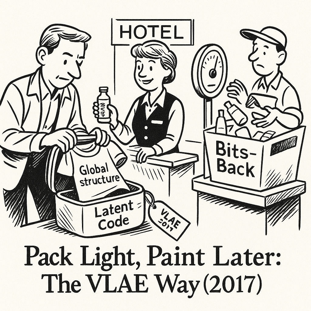 Finally, a training trick called bits-back coding acts as airport staff weighing your suitcase: any detail the decoder and prior can already predict is treated as extra baggage and tossed out. This forces the latent code to stay lean and contain only what’s truly necessary. The result is a model that stores just enough information for faithful reconstruction while keeping files compact and generation fast.