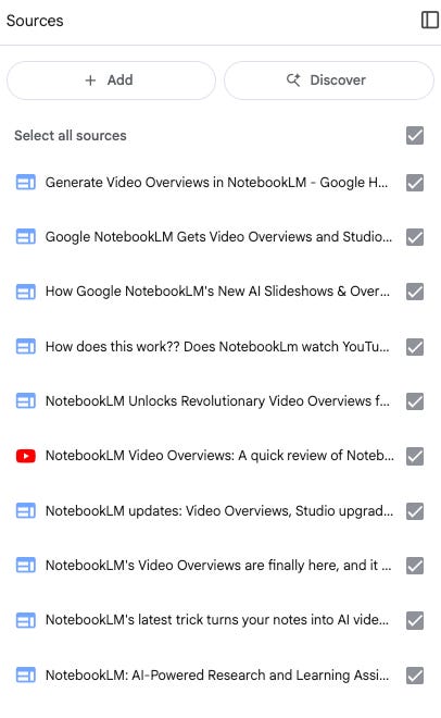 I wrote a simple prompt telling NotebookLM I wanted a video about NotebookLM. It very quickly found ten sources, (and more isn’t always better. I will explain in a moment.)