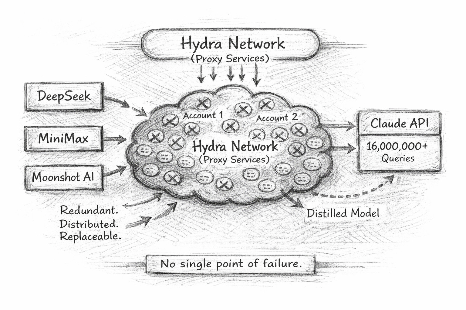 Because Claude is not commercially available in China, the labs allegedly relied on commercial proxy services that resell access to frontier models. These proxy services operate what Anthropic refers to as “hydra cluster” architectures. The term describes sprawling networks of fraudulent accounts designed to distribute traffic across APIs and cloud platforms.