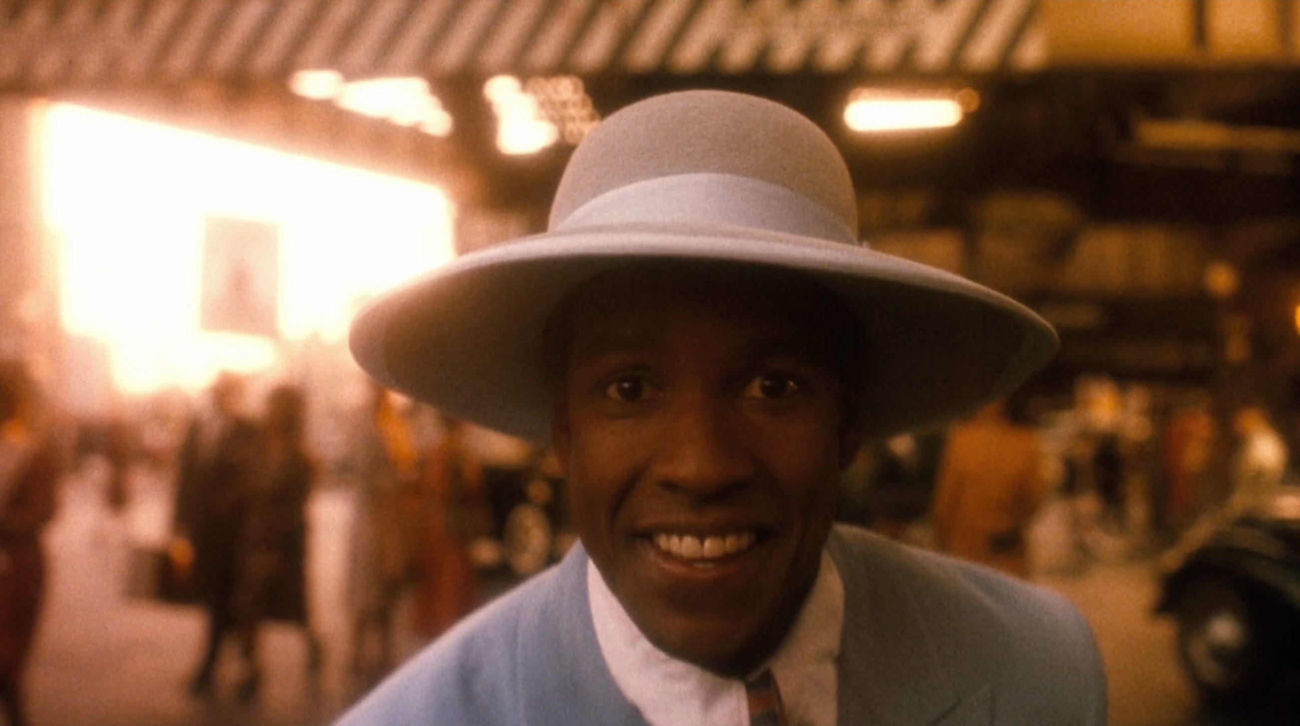 Lee makes his stamp clear from the film’s first moments. Malcolm X opens by cross-cutting between a full-screen, Patton-style Stars-and-Stripes, on which are overlaid the credits, and footage of the LAPD assault on Rodney King, which had occurred a short 20 months before the movie’s release. Towards the end of the credits, the flag begins to burn from its edges, leaving that gigantic “X” standing in the centre, as high as the cinema screen. The meaning of this montage is clear enough: Malcolm and his words may now be considered “history” but the problems he addressed linger. All at once, the viewer must deal with an urgent call-to-arms (the King beating, juxtaposed with the flag) and that reclaimed baseball-cap logo (the X branding); we are then swooped down into 1940s Boston where, moments after his name hovers on screen, we see Spike Lee sauntering confidently into the space. After a few minutes, we are introduced to Denzel Washington’s young and cheery Malcolm, who is “conked” by Lee’s Shorty.
