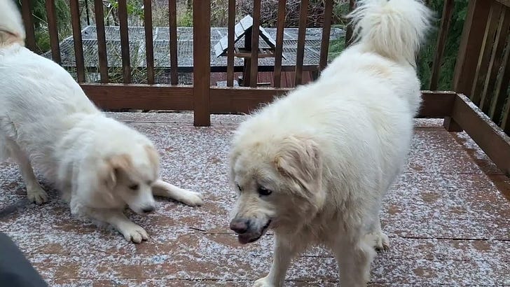 Stepping out into the snow.Puppies are playing, enjoying the snow.Running and hoppingHaving much fun.